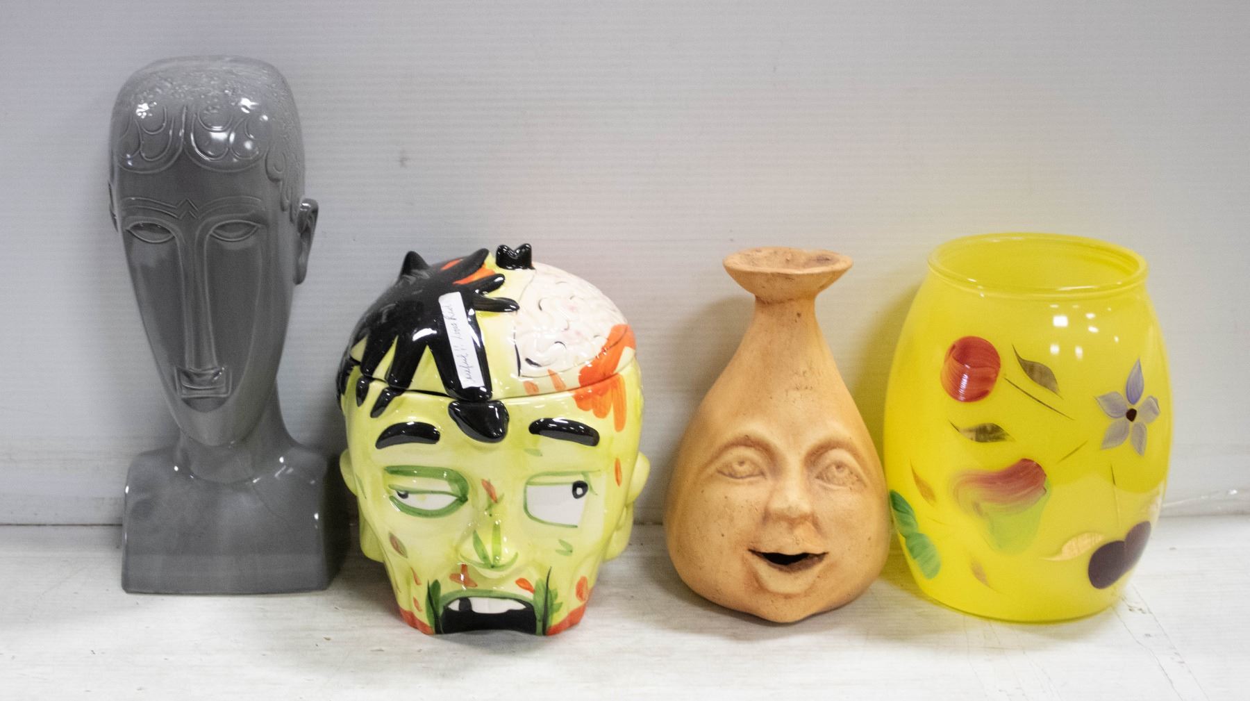 4 PIECE GLASS, CERAMIC ALIEN COOKIE JAR &