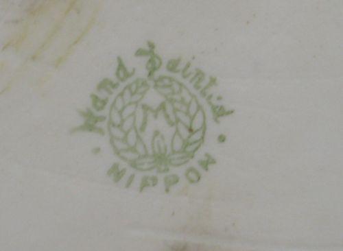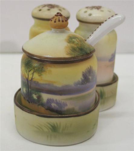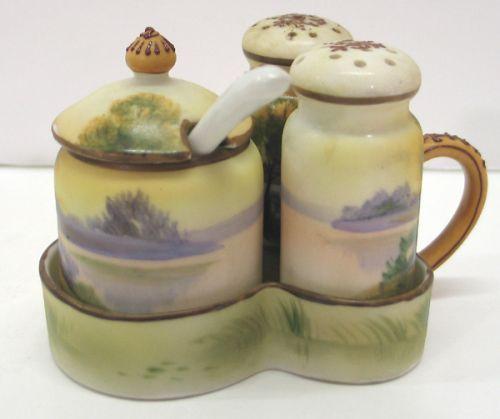4 PIECE NIPPON CONDIMENT SET. Consists of holder with one small sugar container with lid and ladle, and salt and pepper shakers. All are hand painted with coastal landscape scene. Tray is marked on bottom with green Nippon wreath mark. 4” L, 2.5” H