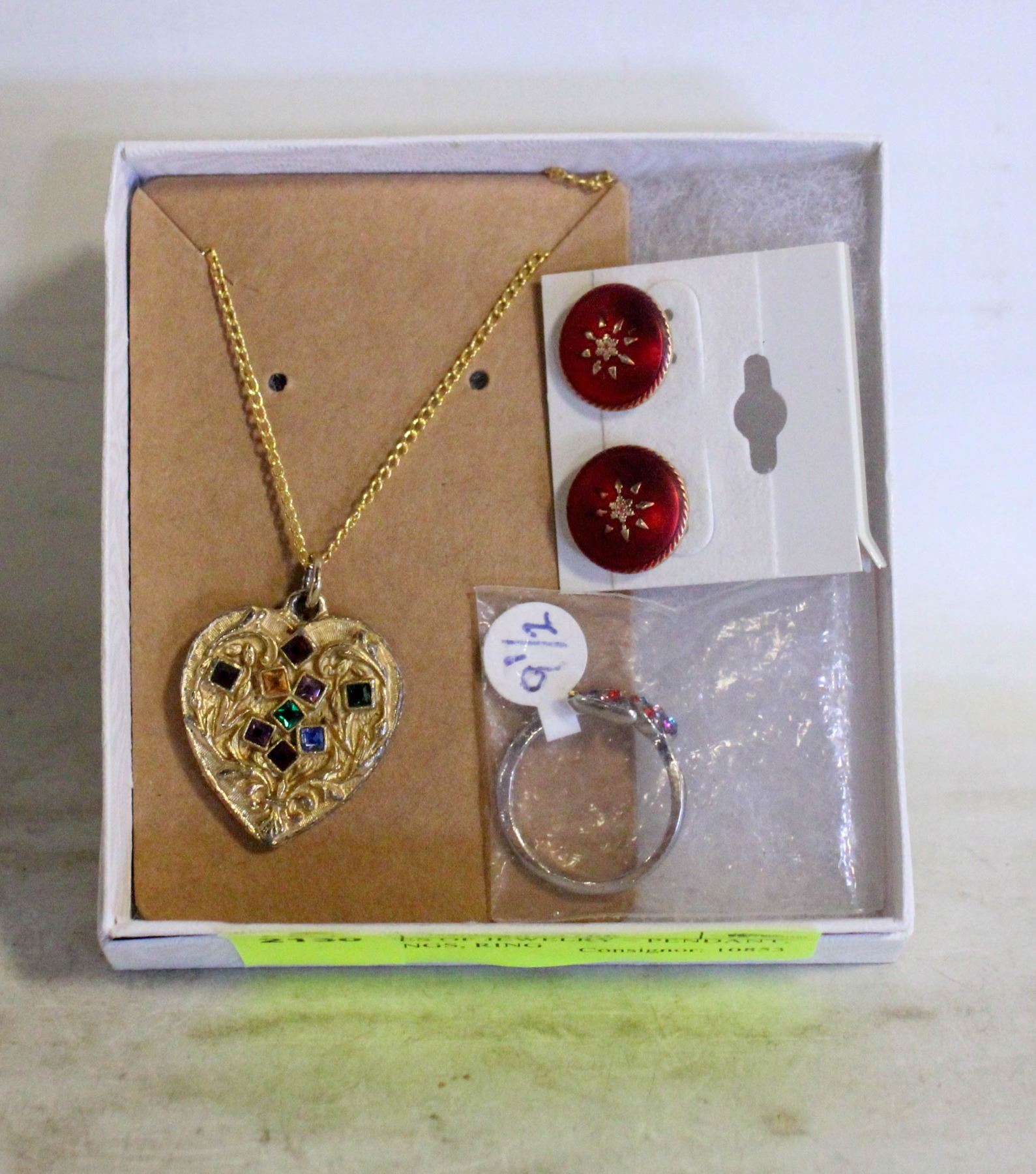 1) GOLDEN TONE HEART PENDANT WITH 9 SQUARE CRYSTALS, WITH A 54 CM. GOLDEN CHAIN ENDING IN A SPRING RING CLASP 2) PAIR OF ROUND METAL, STUD EARRINGS, RED WITH GOLD STAR IN CENTER 3) DAINTY SIZE 9½ RING, SILVER TONE, ADJOINING LEAVES WITH 6 DIFFERENT COLOURED GEMSTONES.