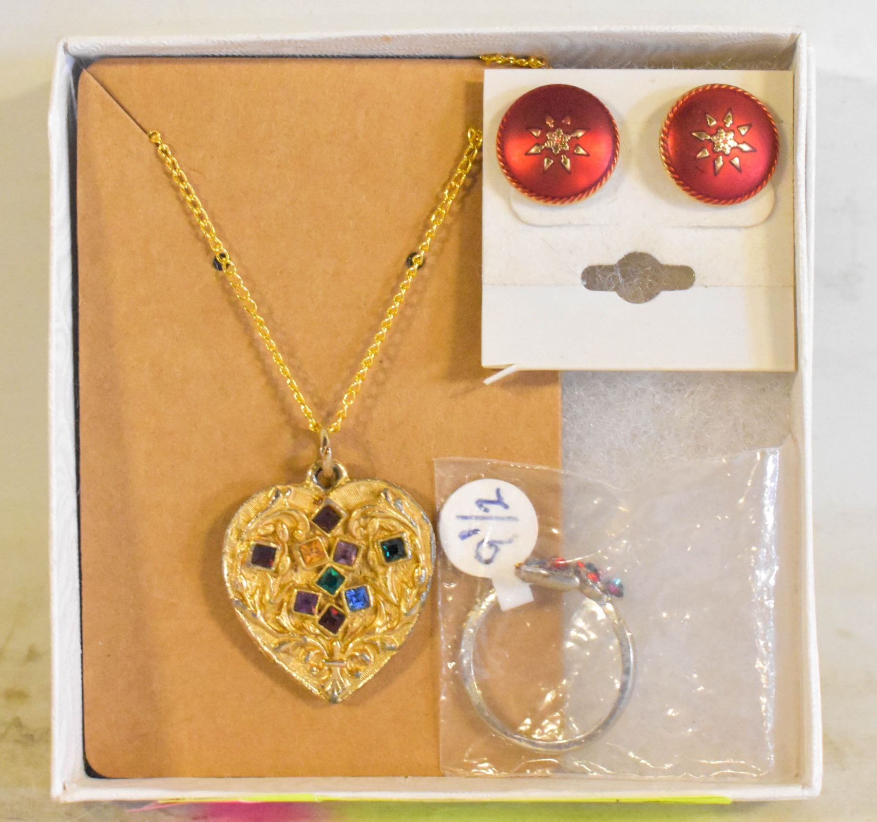 1) GOLDEN TONE HEART PENDANT WITH 9 SQUARE CRYSTALS, WITH A 54 CM. GOLDEN CHAIN ENDING IN A SPRING RING CLASP 2) PAIR OF ROUND METAL, STUD EARRINGS, RED WITH GOLD STAR IN CENTER 3) DAINTY SIZE 9½ RING, SILVER TONE, ADJOINING LEAVES WITH 6 DIFFERENT COLOURED GEMSTONES.