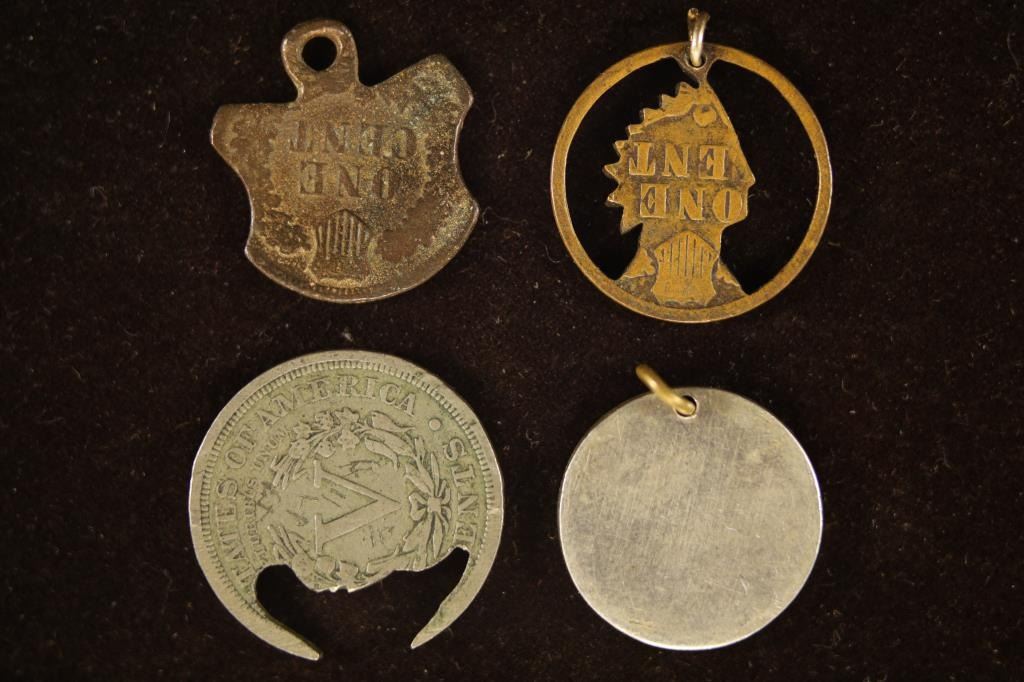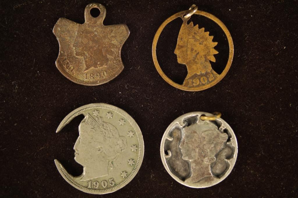 PENDANT, 1902 INDIAN HEAD CENT PENDANT, 1905 LIBERTY "V" NICKEL AND 194? MERCURY DIME PENDANT