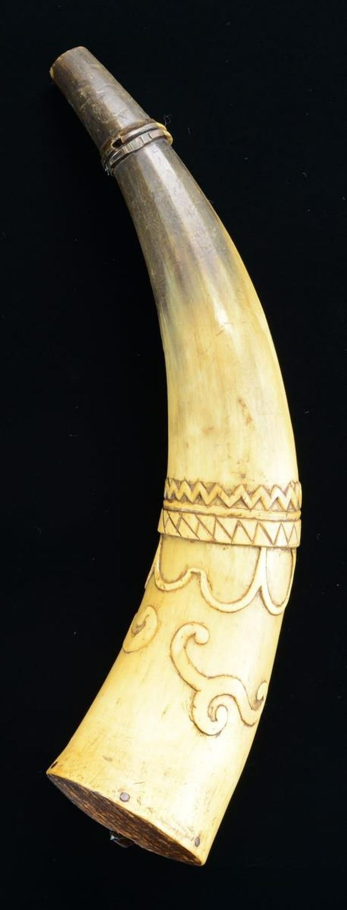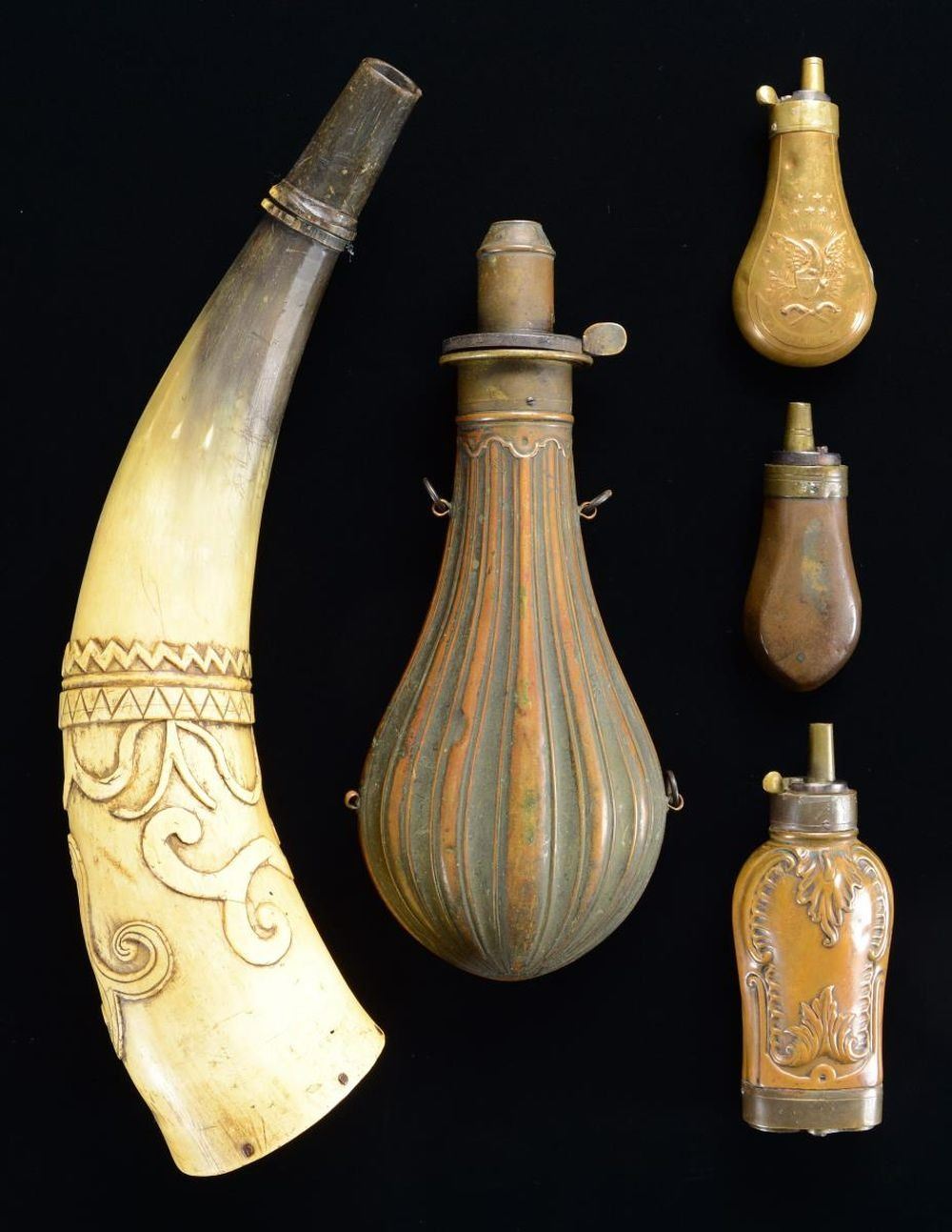 This lot contains 1 powder horn measuring 13 1/2" with relief carved scrollwork & zigzag embellishments. The horn is 3” across at the butt, & the plug is held in place with wooden pins. / 1 Powder flask measuring 9” with a fluted copper body & a brass charger. The charger is marked “AM FLASK & CAP CO”. / 1 Powder flask measuring 4 3/4". The flask has scroll decoration on a brass body with brass charger and a brass base with 2 chambers covered by small brass covers secured with a screw. / 1 Powder flask measuring 3 3/4" with a brass body & brass charger. The body is decorated with an eagle over crossed pistols surrounded by a glory and 13 stars. A banner beneath the eagle reads “E PLURIBUS UNUM”. / 1 Powder flask measuring 3 1/2" with a plain brass body & brass charger. The charger lever is broken. CONDITION: all items show light wear except as noted. The large and two smallest powder flasks have minor dents to the body. All chargers function except for the smallest flask. PROVENANCE: from the Lifelong Collection of Glen E. Mattox. (02-18767/BF). $400-600.