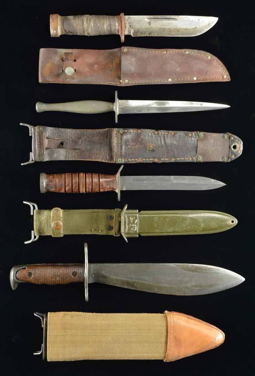 1) WWI A.C. CO US MODEL 1917 C.T. BOLO KNIFE. Overall: 14 3/4". Bolo blade 10" w/ left ricasso marked "A.C.CO / CHICAGO / 1918" & right ricasso marked "U.S. MOD. 191 / C.T.". Grooved wood grip panels. Canvas covered scabbard w/ brown leather tip marked "BRAUER BROS. / 1918". CONDITION: Blade has been cleaned w/ sharpening of edge obscuring markings. Good grips w/ some erosion & chips. Good scabbard.