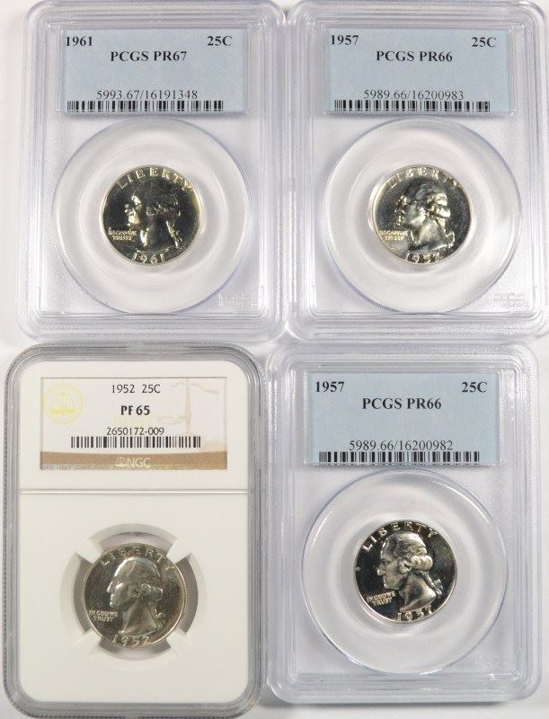 4 PROOF WASHINGTON QUARTERS 2 1957 PCGS PR-66, 61 PCGS PR-67, 52 NGC PF-65