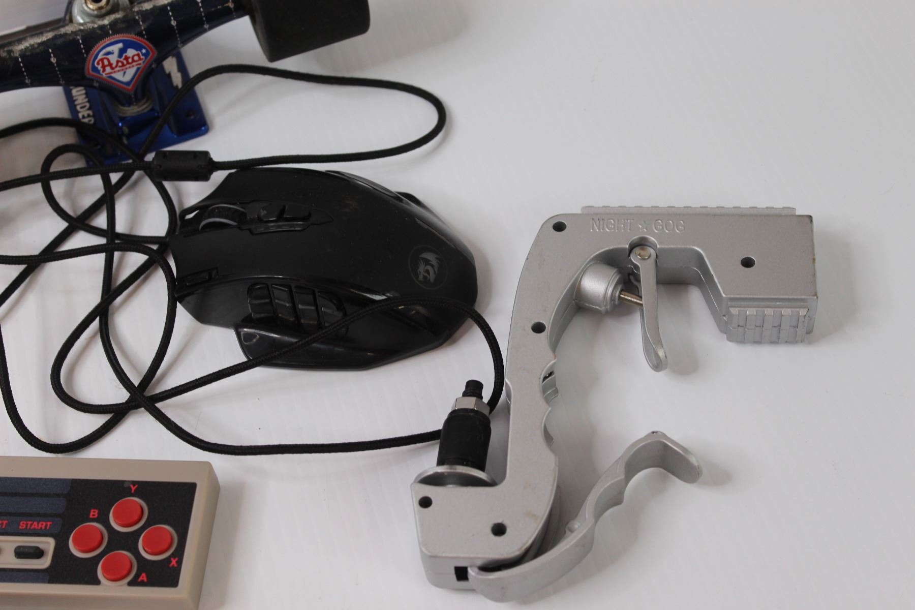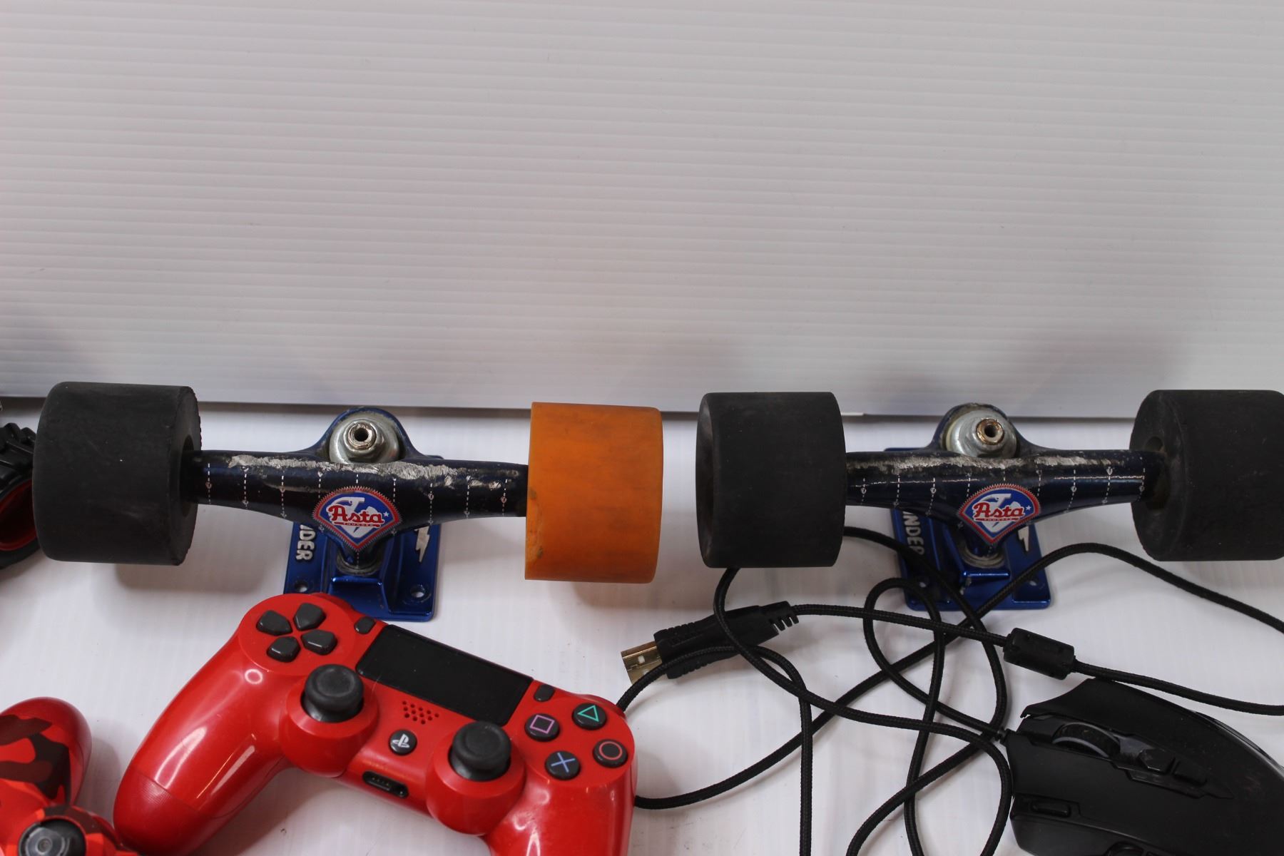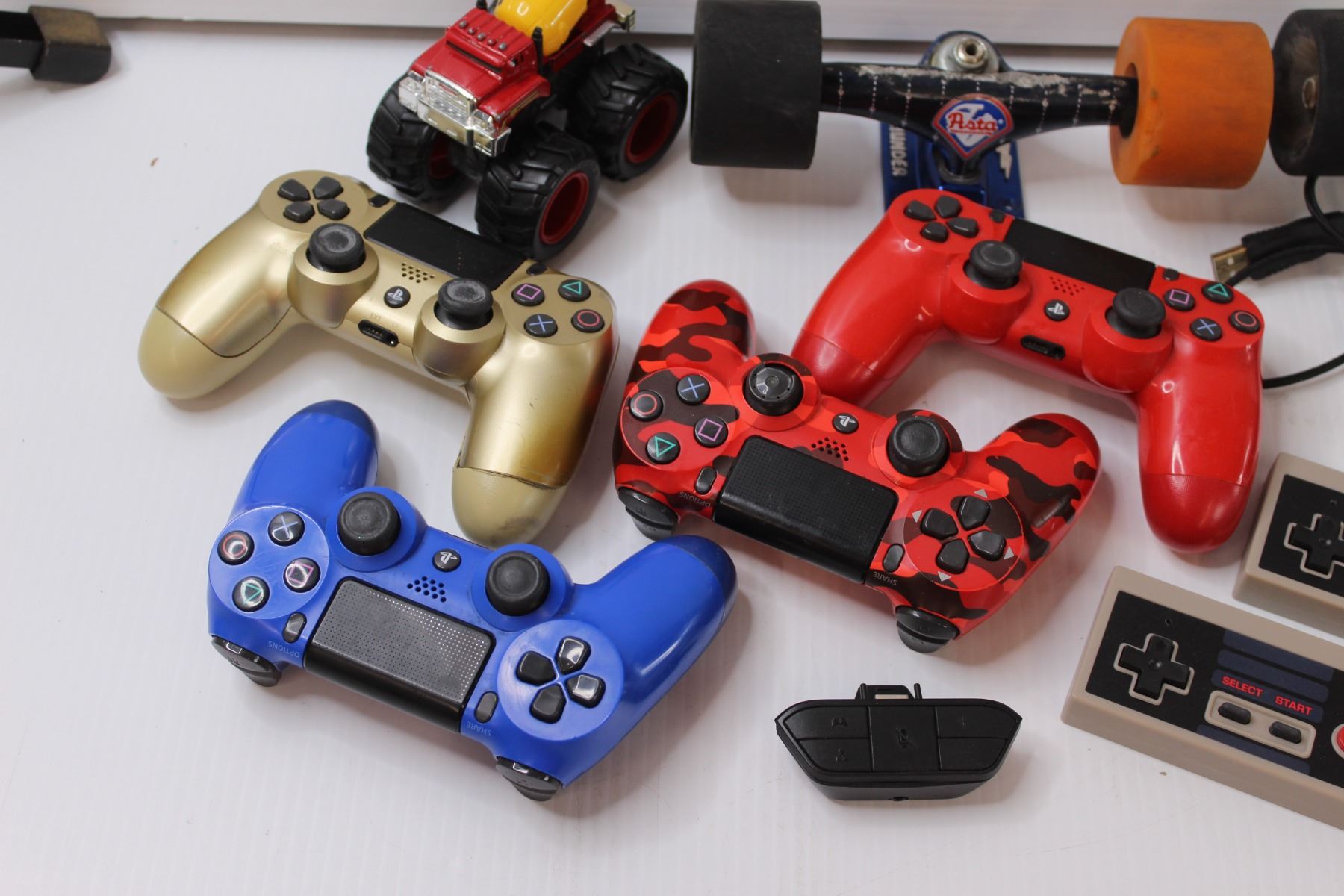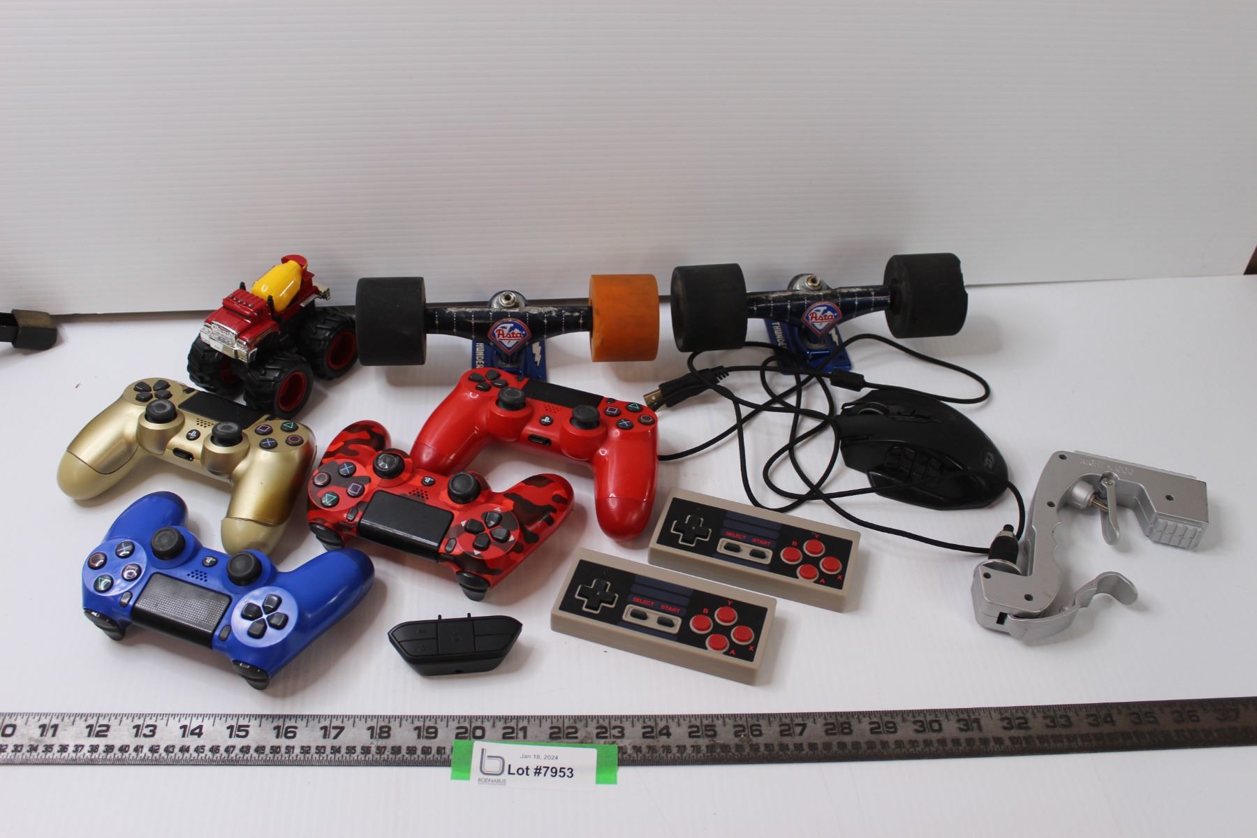 (4) PS4 Controllers, (2) Nintendo Controllers, PC Mouse, Skateboard Trucks, Liquor Gun, Tonka Monste