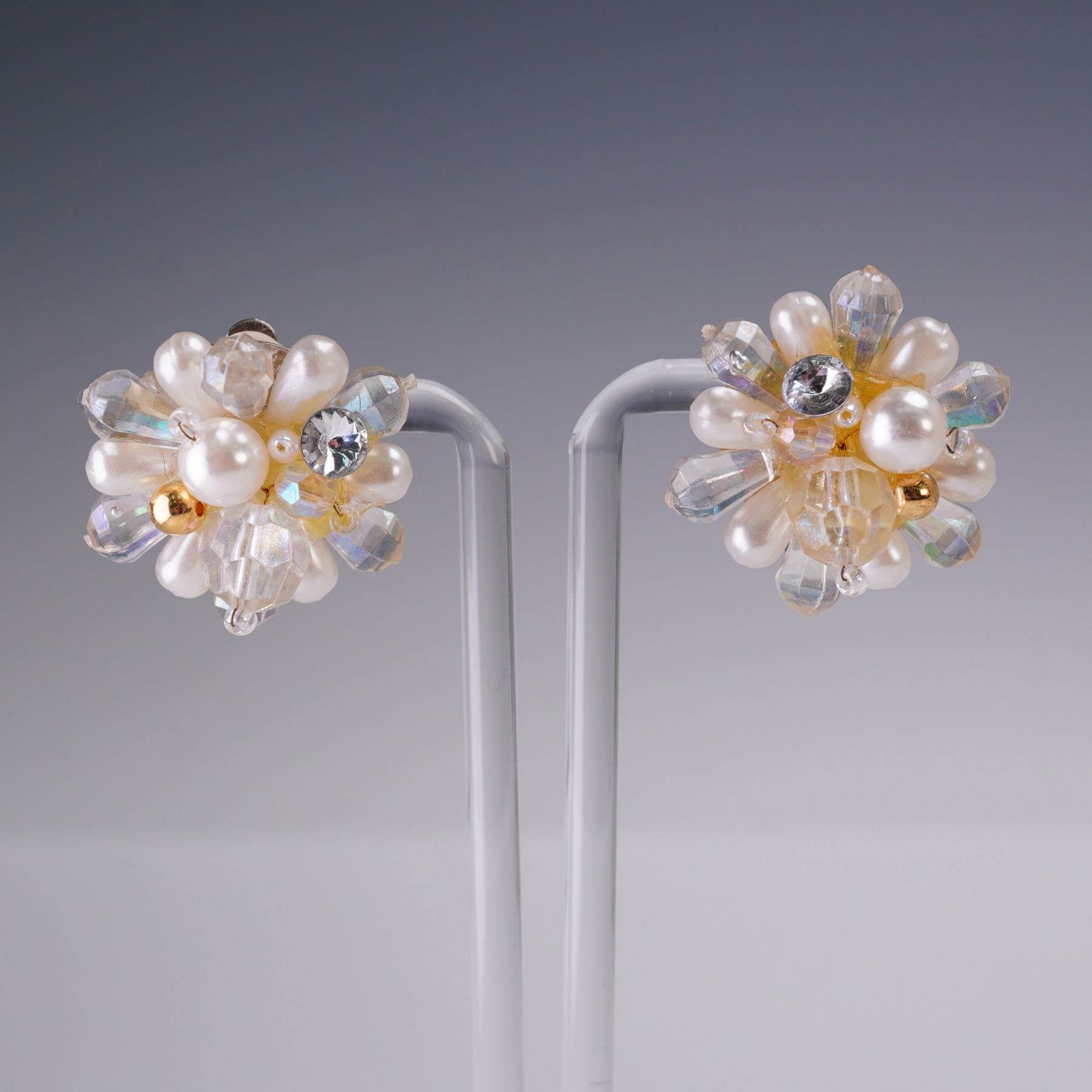 4pr lot of assorted earrings including one pair of gold tone teardrop hoops, one pair of wired faux pearl drops on card, one pair of gold tone textured clip-ons, and one pair of beaded cluster clip-ons with faux pearls and aurora borealis accents. Sizes range approximately from 1"H to 1.75"H.