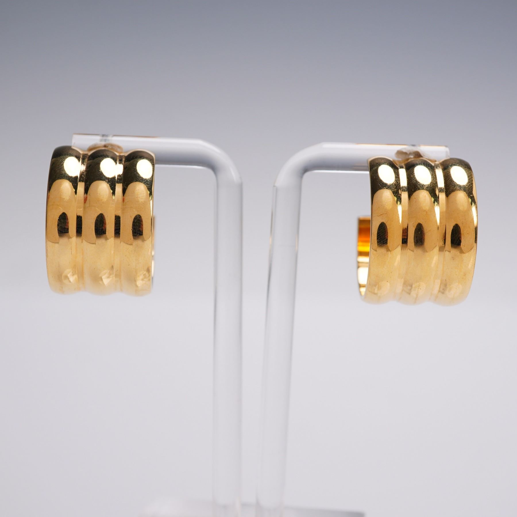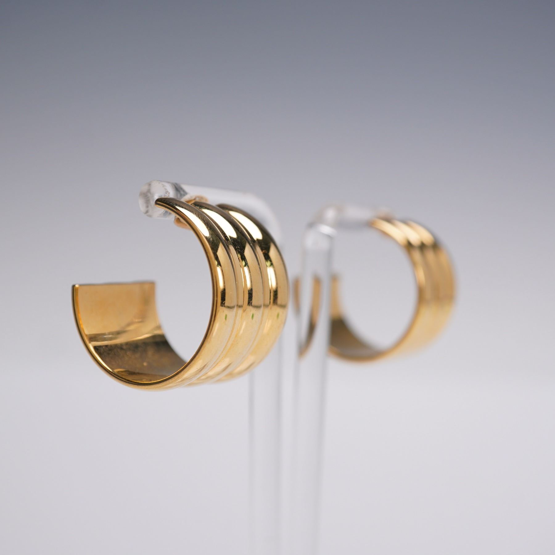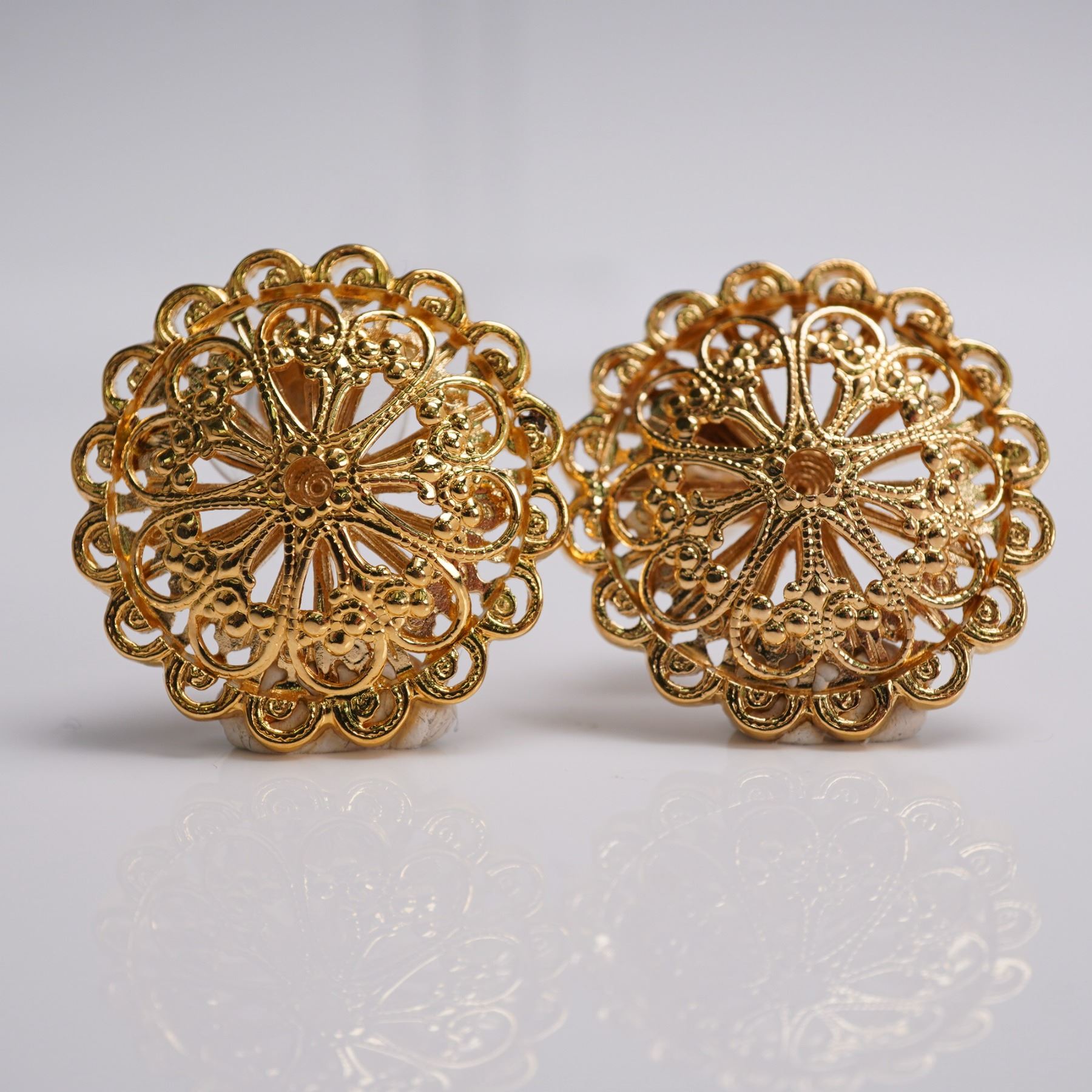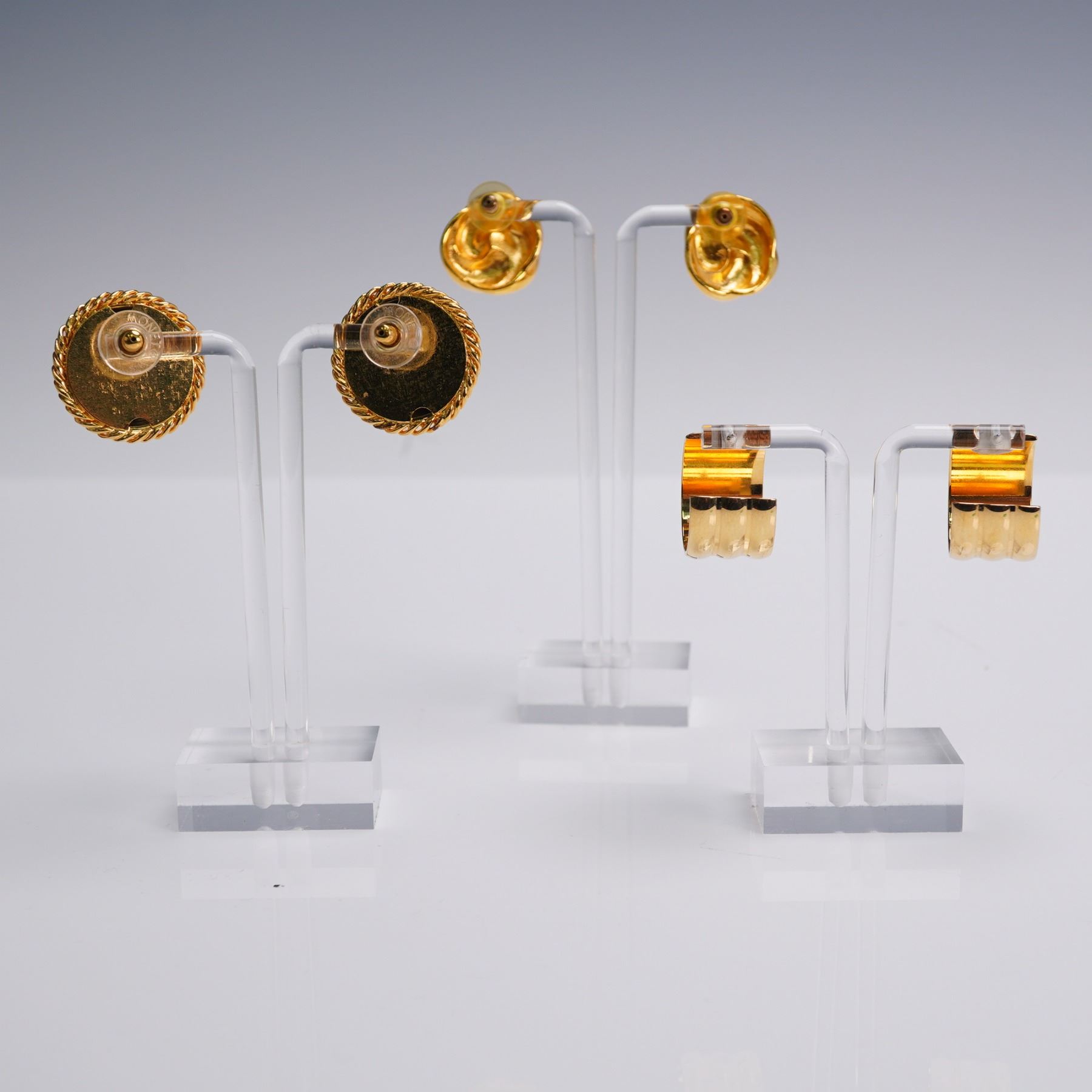 Lot of four pairs of vintage-style ladies gold tone earrings. Includes domed button studs with rope edging marked Monet, a pair of twisted knot studs, bold scalloped hoop clips, and intricately detailed floral filigree medallions. Sizes range approximately from 1"H to 1.25"H.
