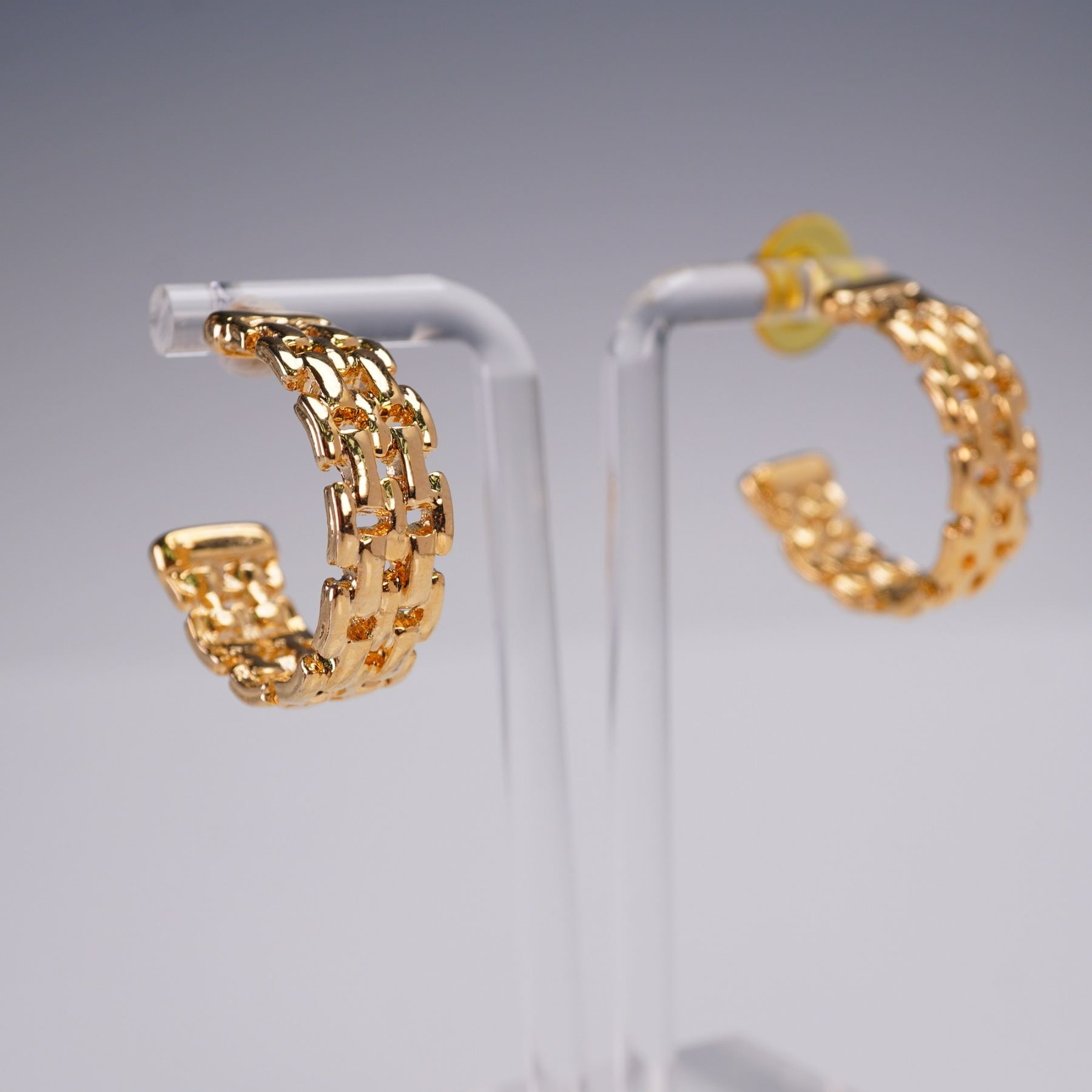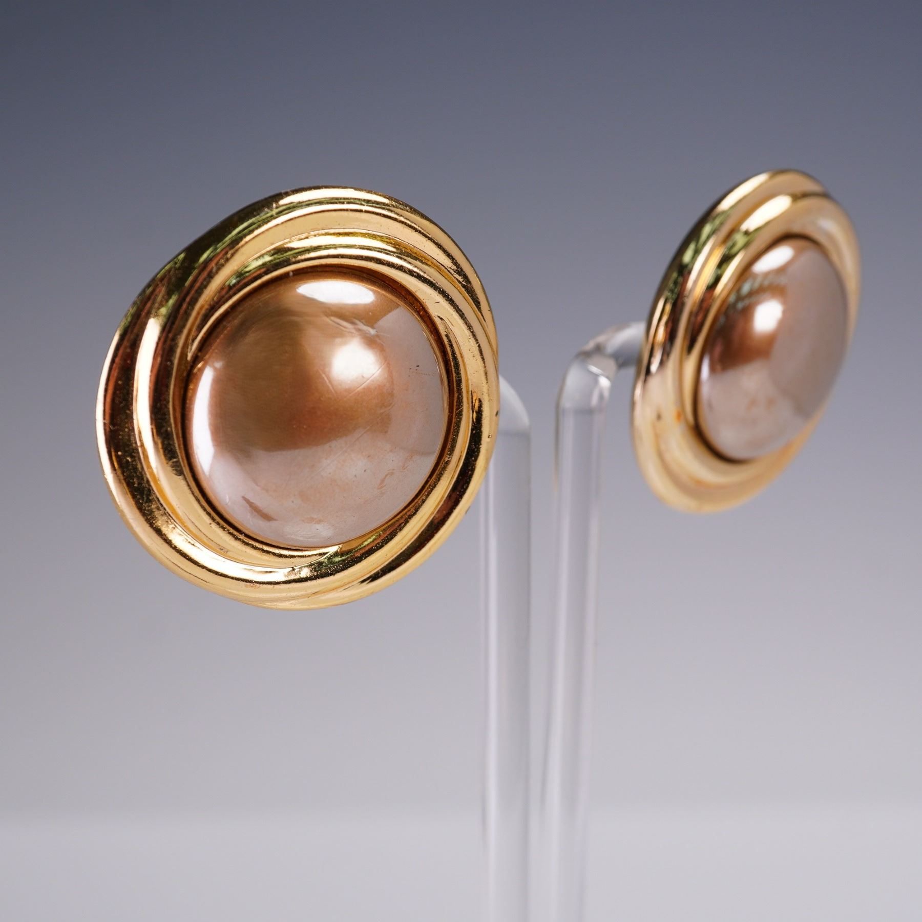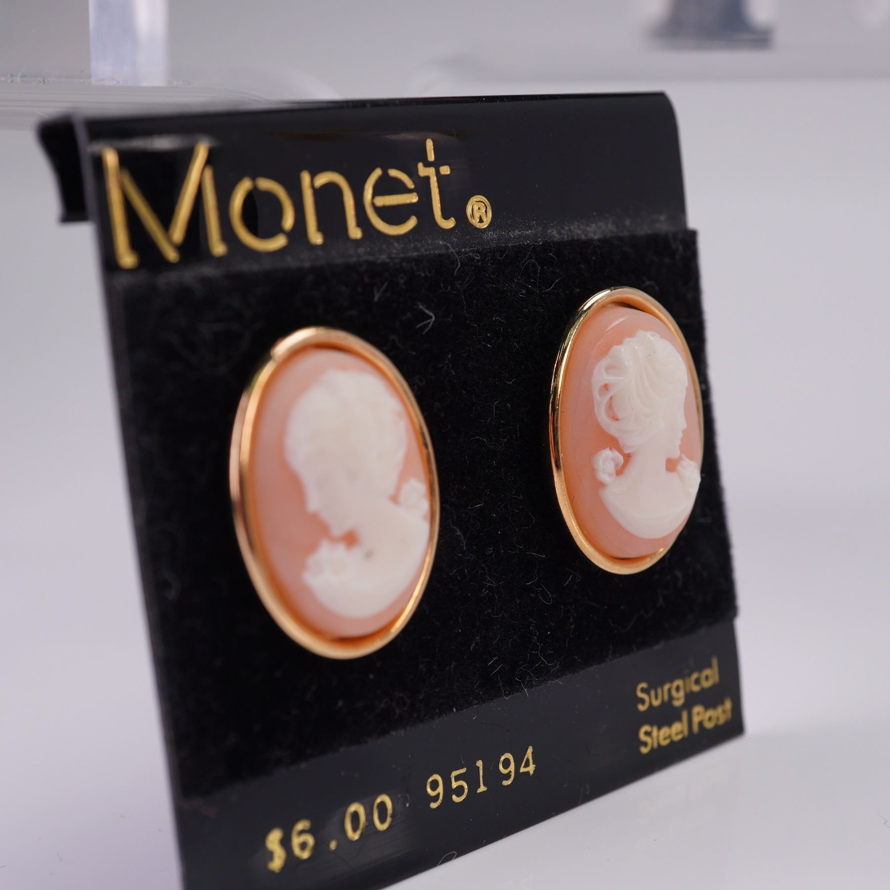 Lot of four pairs of ladies post-back earrings in assorted styles. Includes a pair of sculpted rose gold tone button studs, sparkling rhinestone heart clusters, a pair of gold tone chain-link style hoops, and a cameo stud set on Monet card. Sizes range approximately from 0.75"H to 1.5"H.