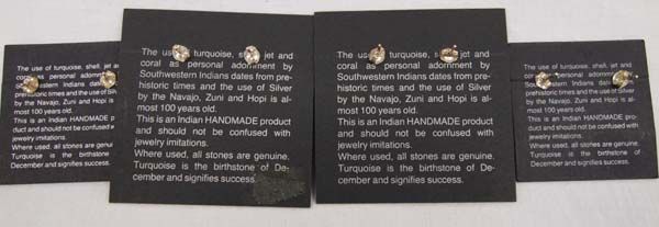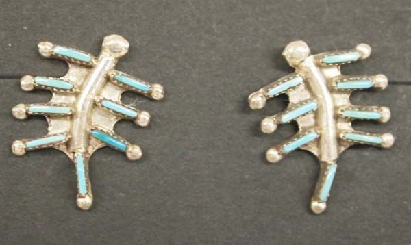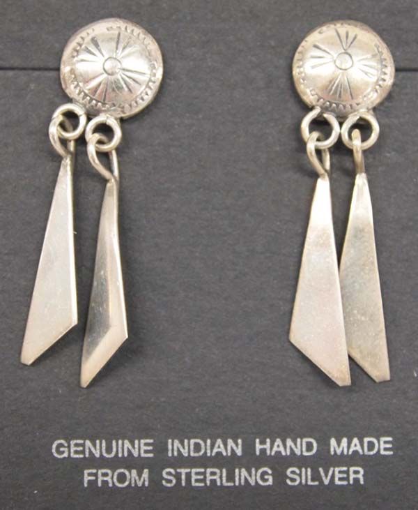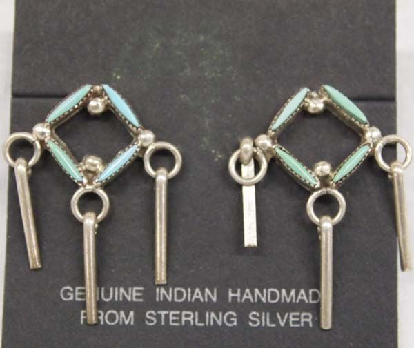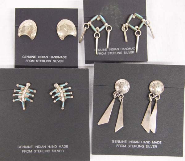 4 Pairs Zuni and Navajo Sterling Earrings, longest (silver dangles) measure 1.25''L x .25''W, #1 Navajo Sterling Silver Hand Stamped Earrings #2 Navajo Sterling Hand Stamped Crescent Earrings #3 Zuni Sterling Turquoise Needlepoint Earrings #4 Zuni Sterling Turquoise Needlepoint Earrings, approx. 6.71g in total wt.