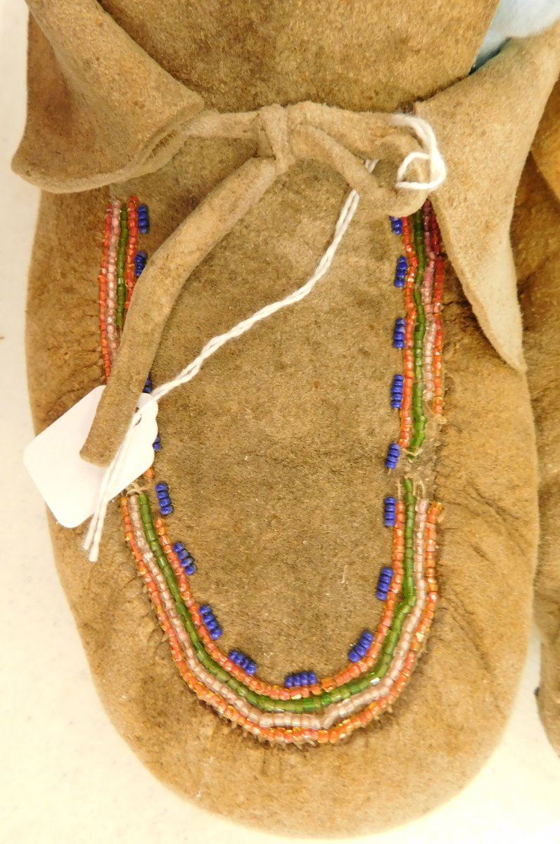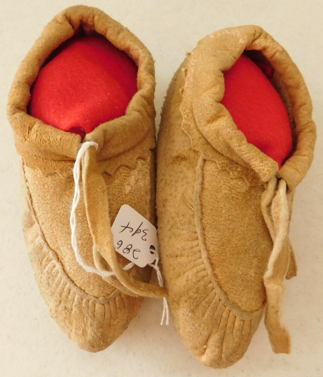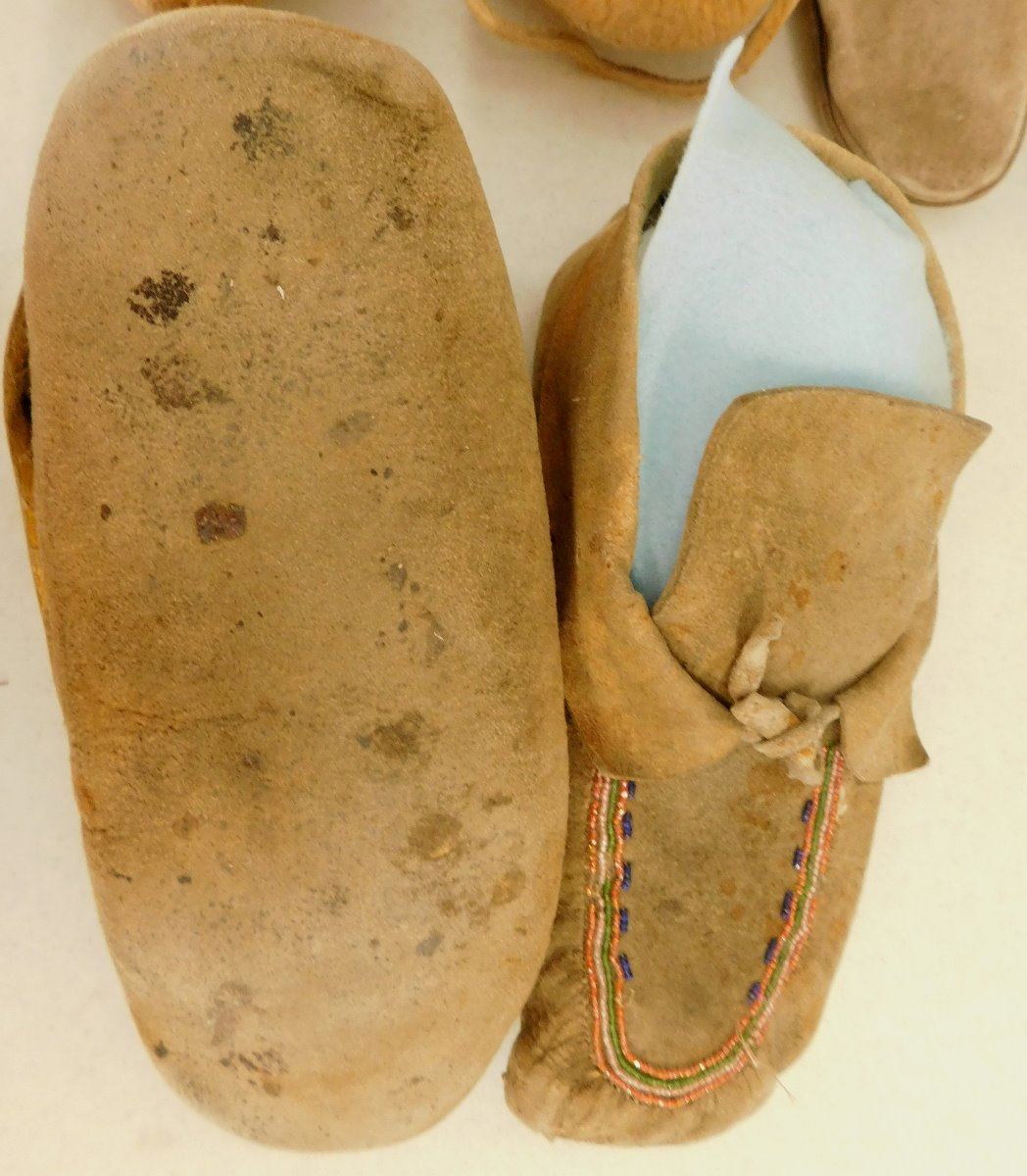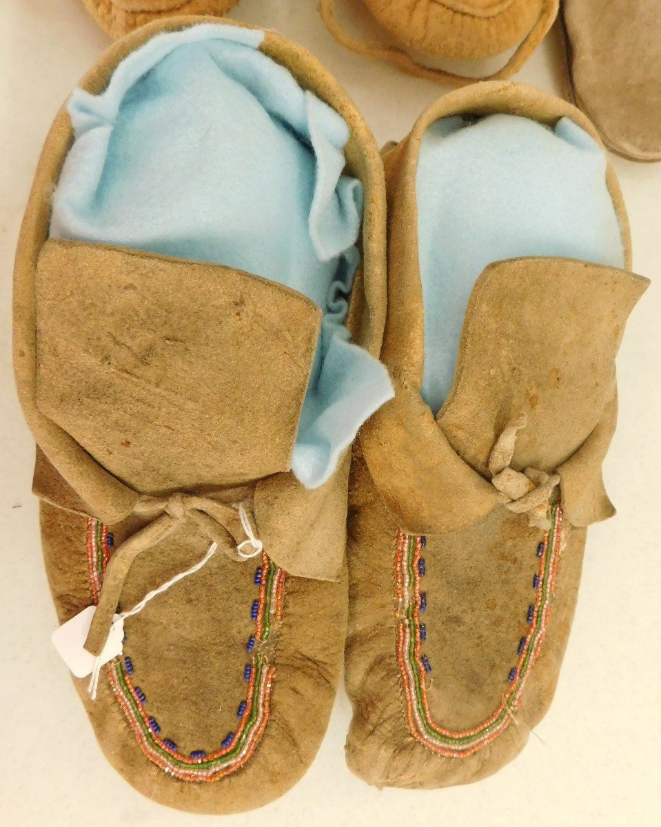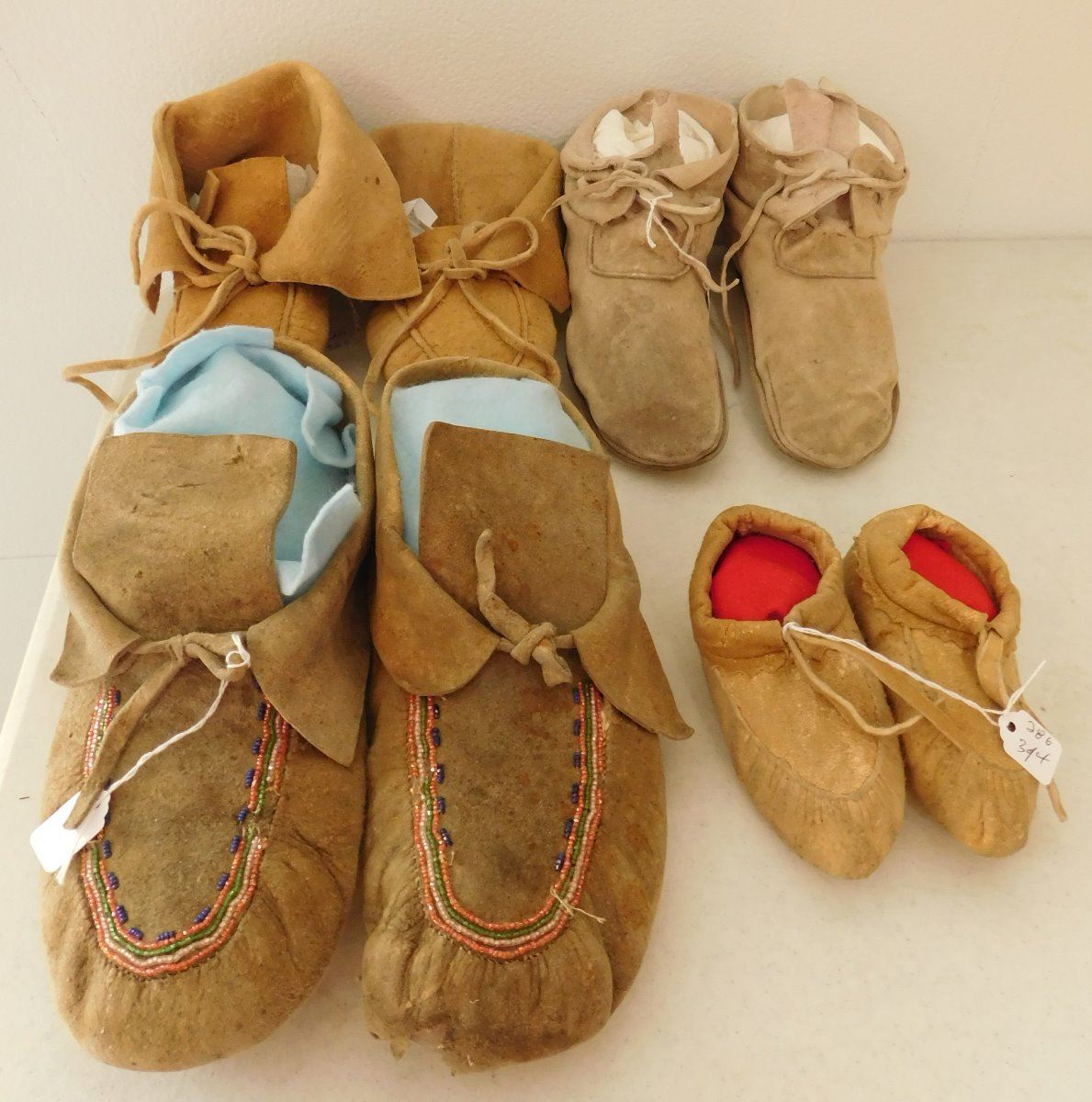 4 Pairs of Beaded & Plain Moccasins, circa 1900. Made of deerhide and moosehide, the items are 6" x 2.5" x 2.25" to 10.5" x 5" x 4". Cree, Canada. Collection of old moccs. Condition: Nice, see images. Shipping: $27.50 w/insurance and signature.