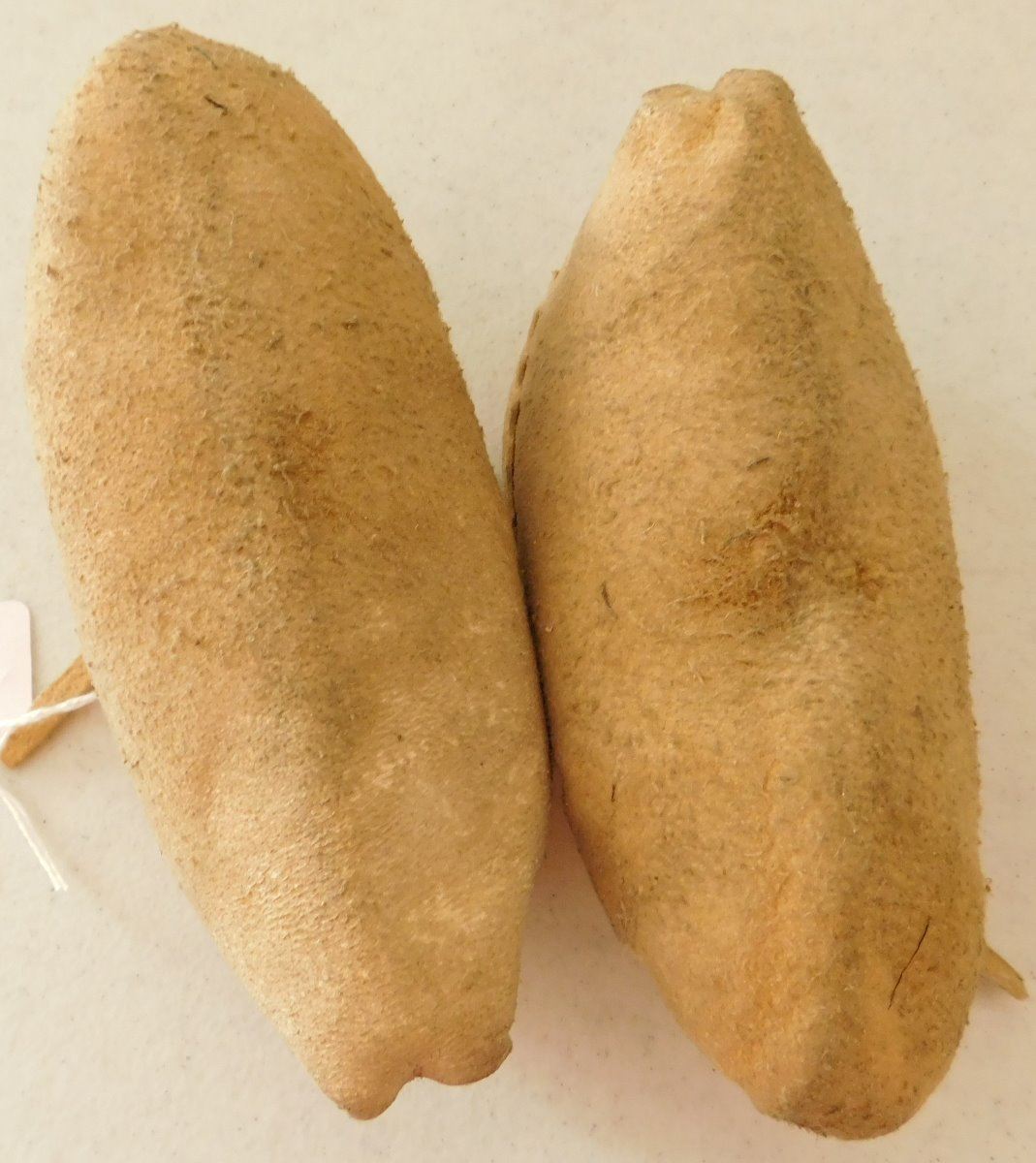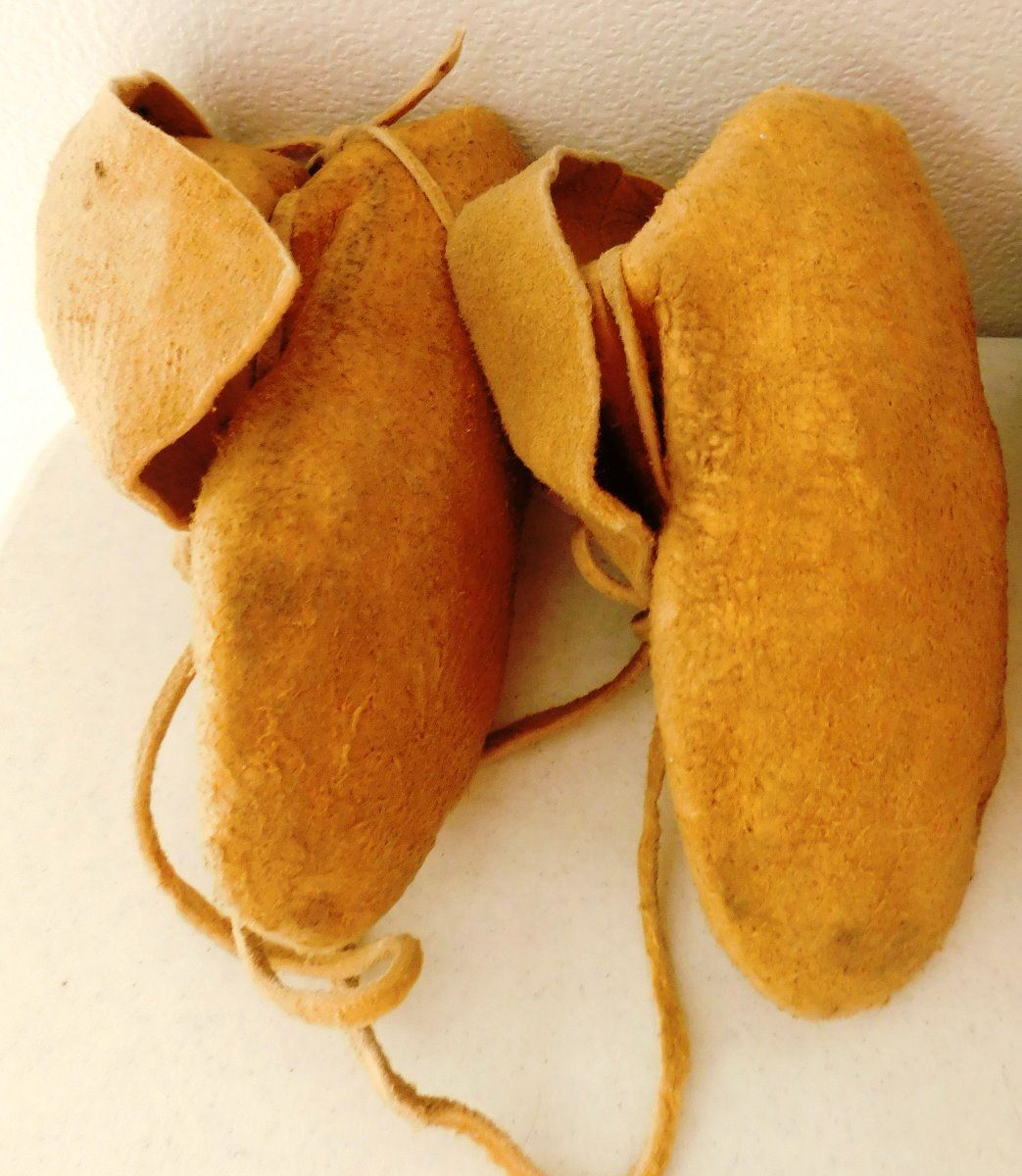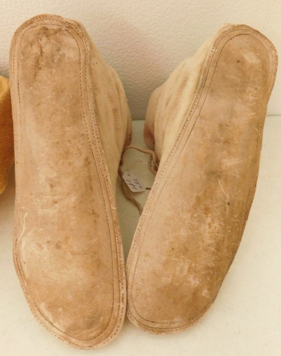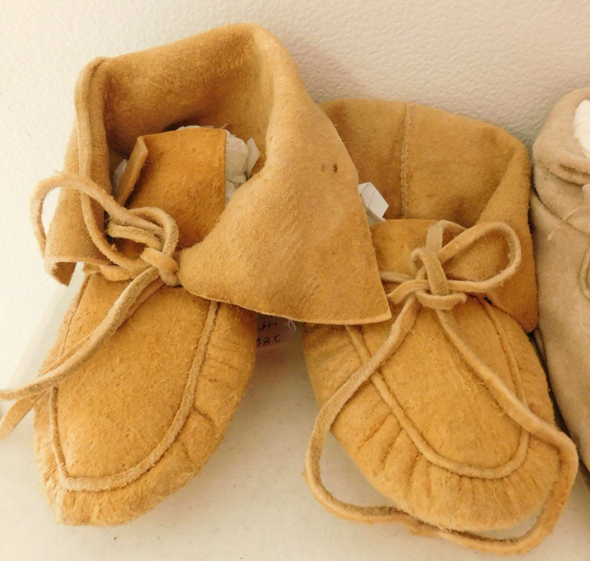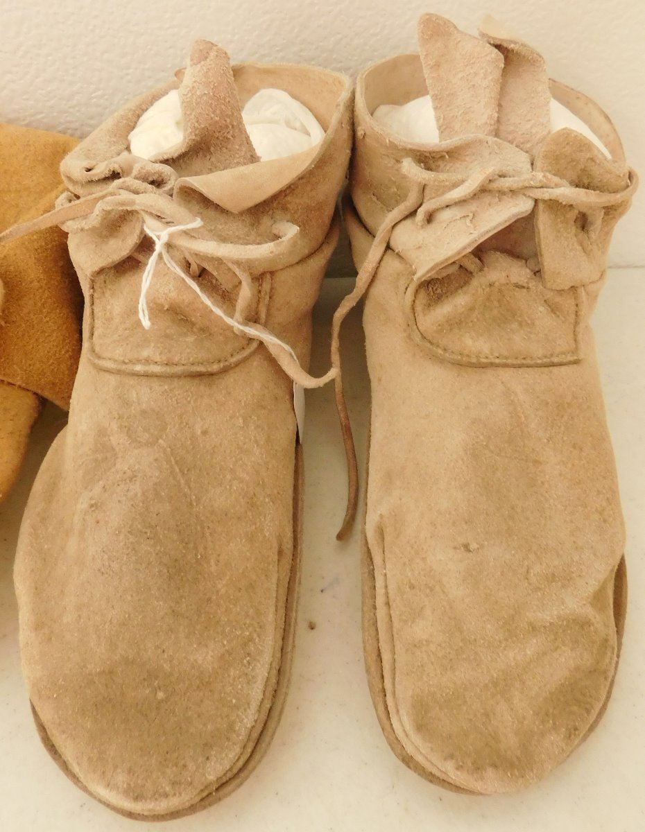 4 Pairs of Beaded & Plain Moccasins, circa 1900. Made of deerhide and moosehide, the items are 6" x 2.5" x 2.25" to 10.5" x 5" x 4". Cree, Canada. Collection of old moccs. Condition: Nice, see images. Shipping: $27.50 w/insurance and signature.