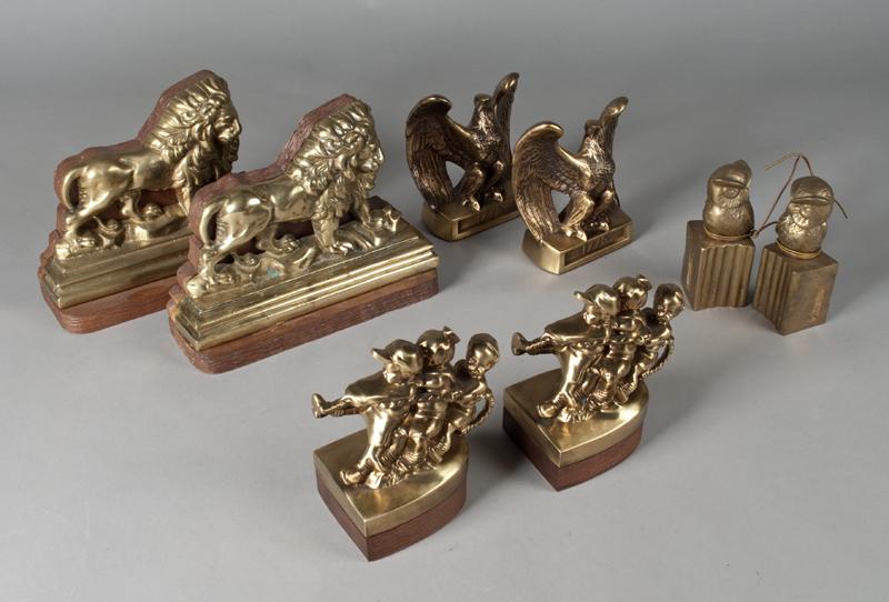 Includes a pair of owl bookends, bookends with three children playing tug-of-war, a pair of lion bookends, and a pair of American Eagle bookends. Largest 10.25" L.