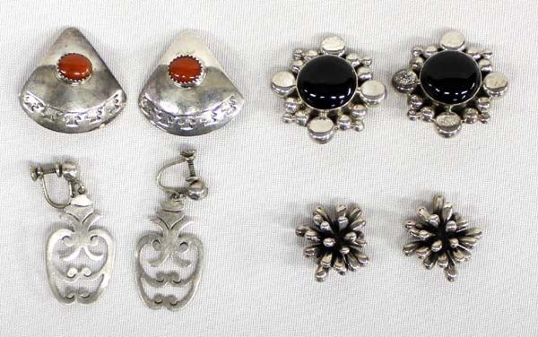 4 Pairs of Sterling Silver Clip-On & Screwback Earrings, includes 3 pairs of Taxco and 1 pair of Native American Navajo Sterling Coral Earrings by S & A Nez of Shiprock, NM, largest pair measures 1.25'' x 1.25'', all earrings are marked