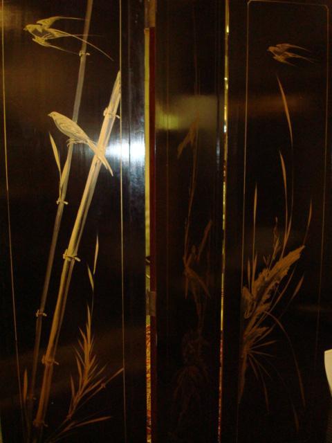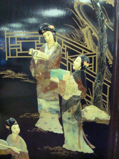 4 Panel Jade Inlaid Oriental Screen: Each Panel is 18"W X 7'T with Geishas and Botanicals with Gold Accents. Reverse has Gold Painted Birds on Each Panel. (400-600)