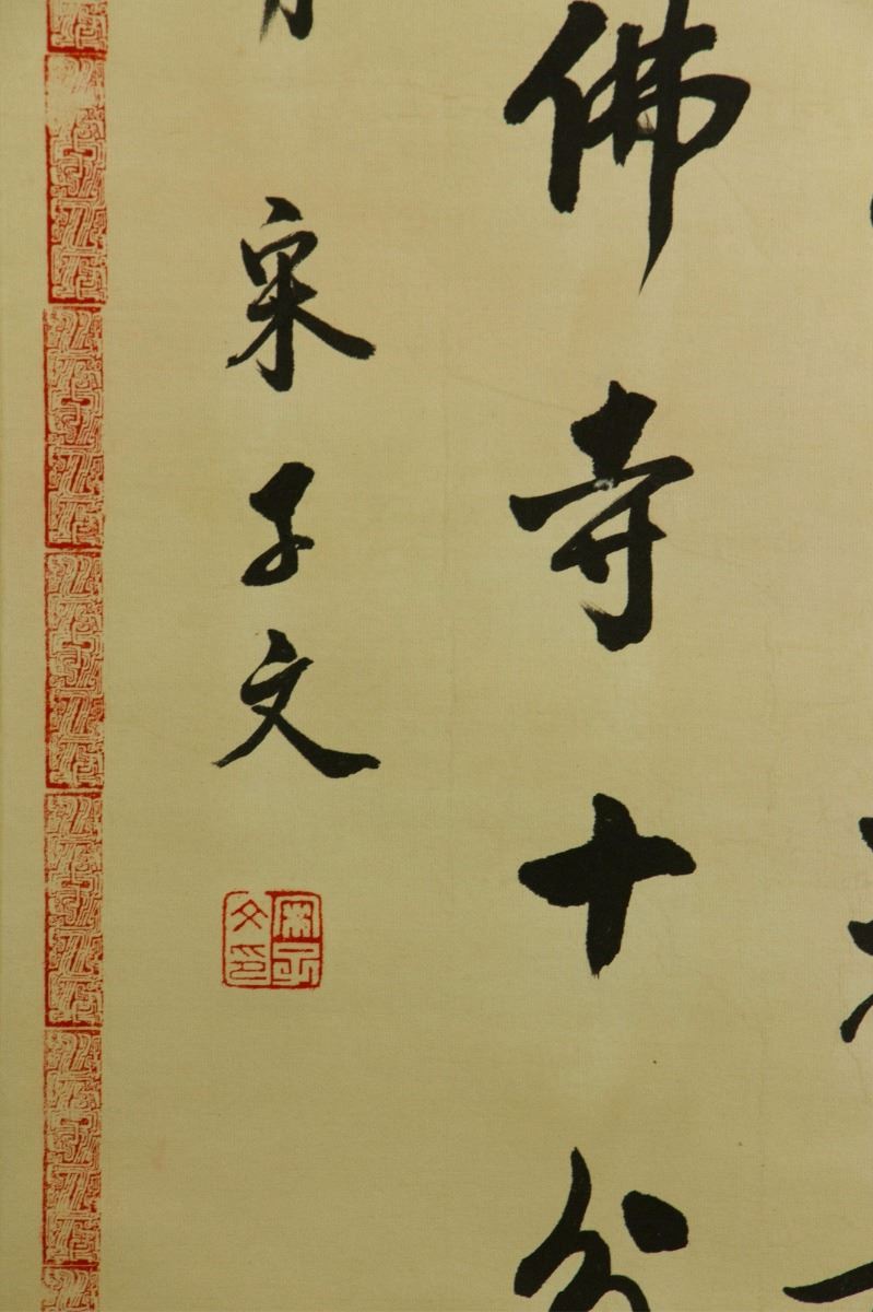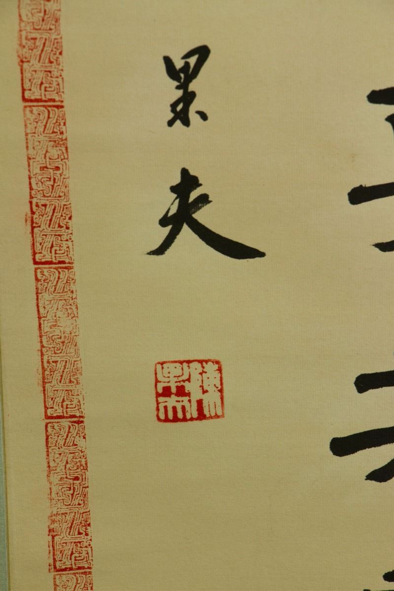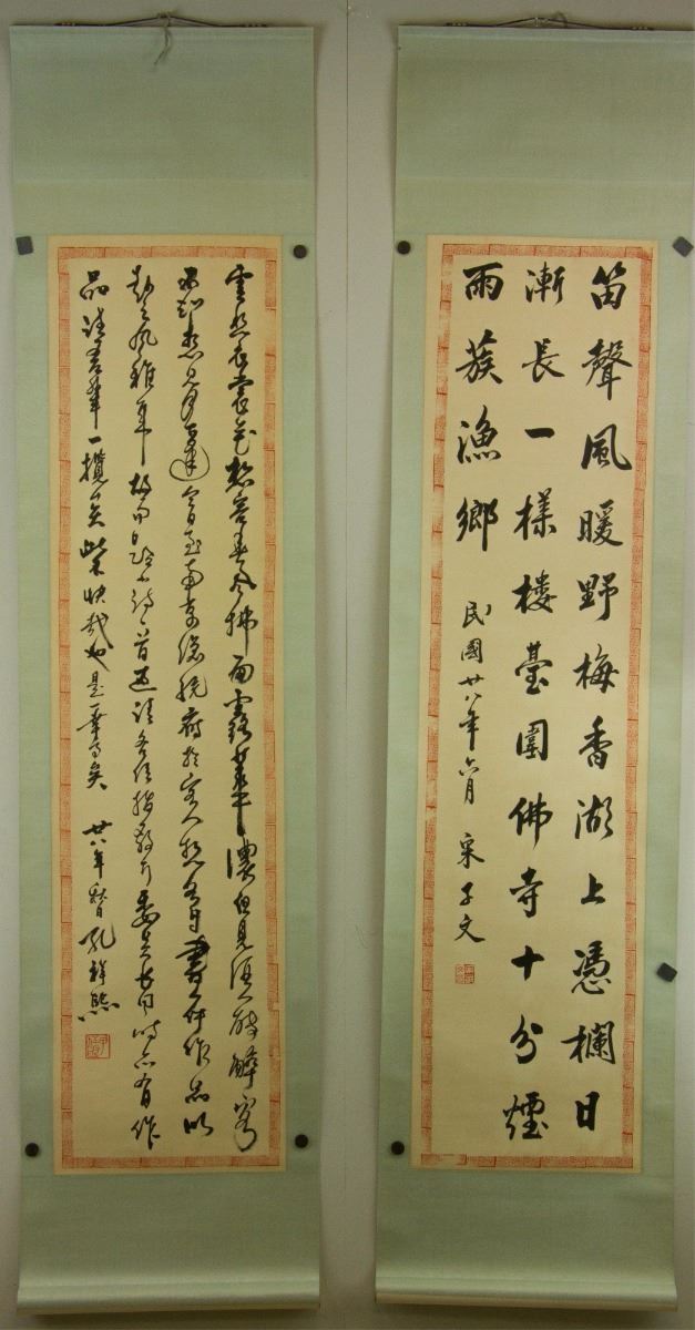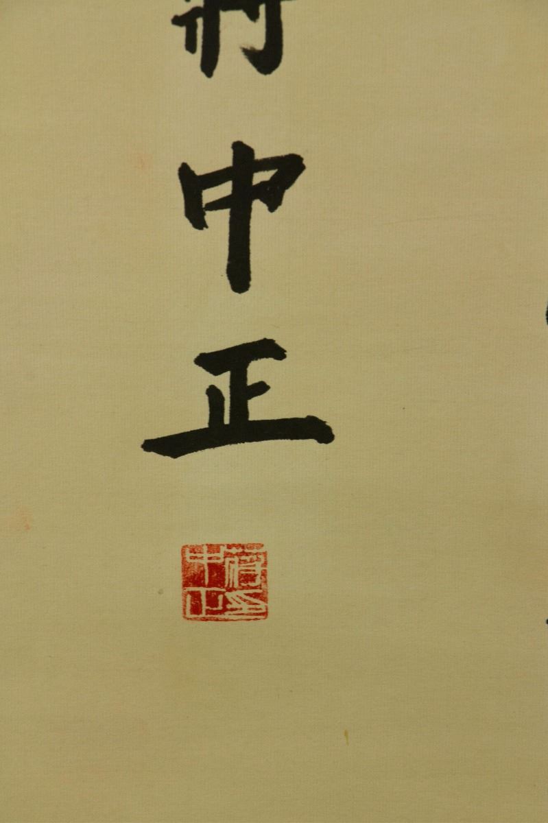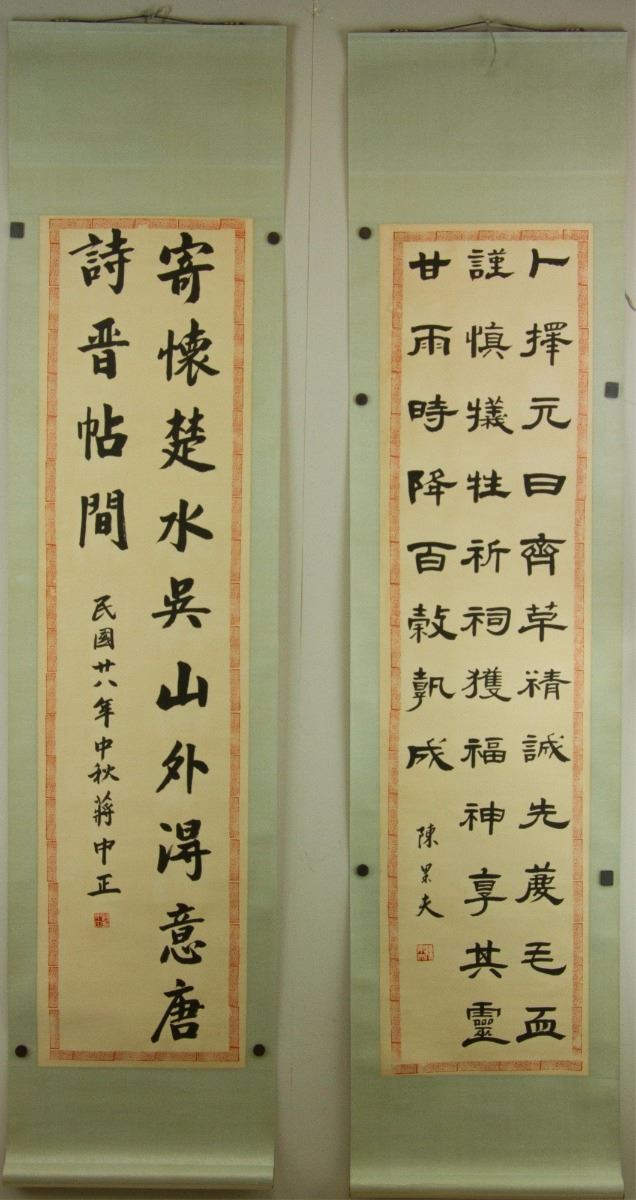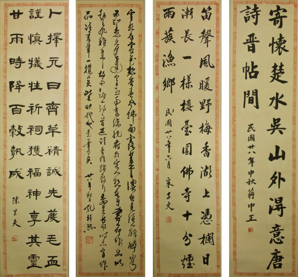 Script calligraphy; Chinese ink on paper; four hanging scrolls; signed by H. H. Kung (1880-1967), Chen Guofu (1892-1951), Chiang Kai-shek (1887-1975), and T. V. Soong (1894-1971) and inscribed with seals; 137 cm x 34 cm each