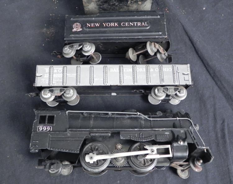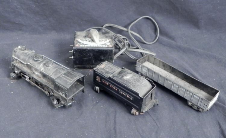 Here are 4 items are from a vintage Marx model railroad set. They ares in good condition, with some paint wear and surface rusting. They need an overall cleaning, and are untested. The size is O guage. They are tin litho bodied. They include a #999 engine, one NYC coal car, and B & O 25 4000 car. The transformer is 50 watts.These are great for vintage "Marline" sets.