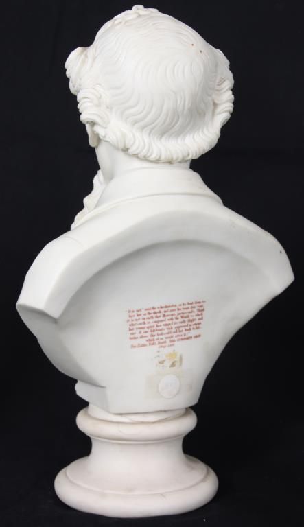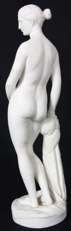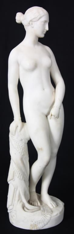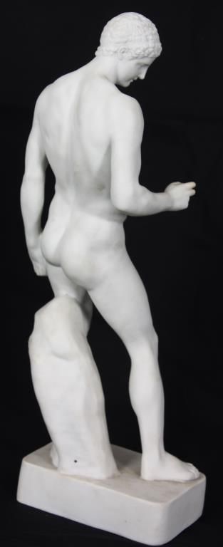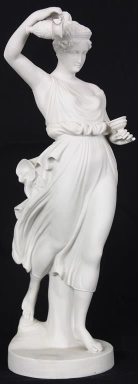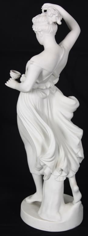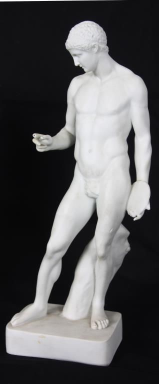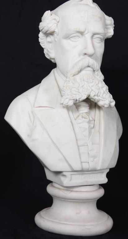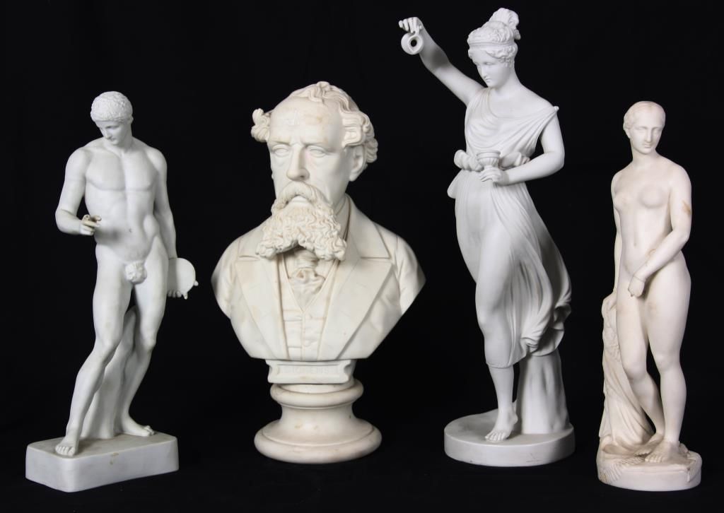 4 Pc. Pairan Figural Sculptures. All with some damage. Bust of Charles Dickens with a crack in the base; figural bust of a standing nude woman, leaning against a post, has a break and repair to her left arm and her fingers; standing figure of a discus thrower, repair to one finger; and a woman walking forward, her long dress blowing in the breeze, she hold a pitcher up in one hand and a goblet in the other, missing one finger. 18 in. high.