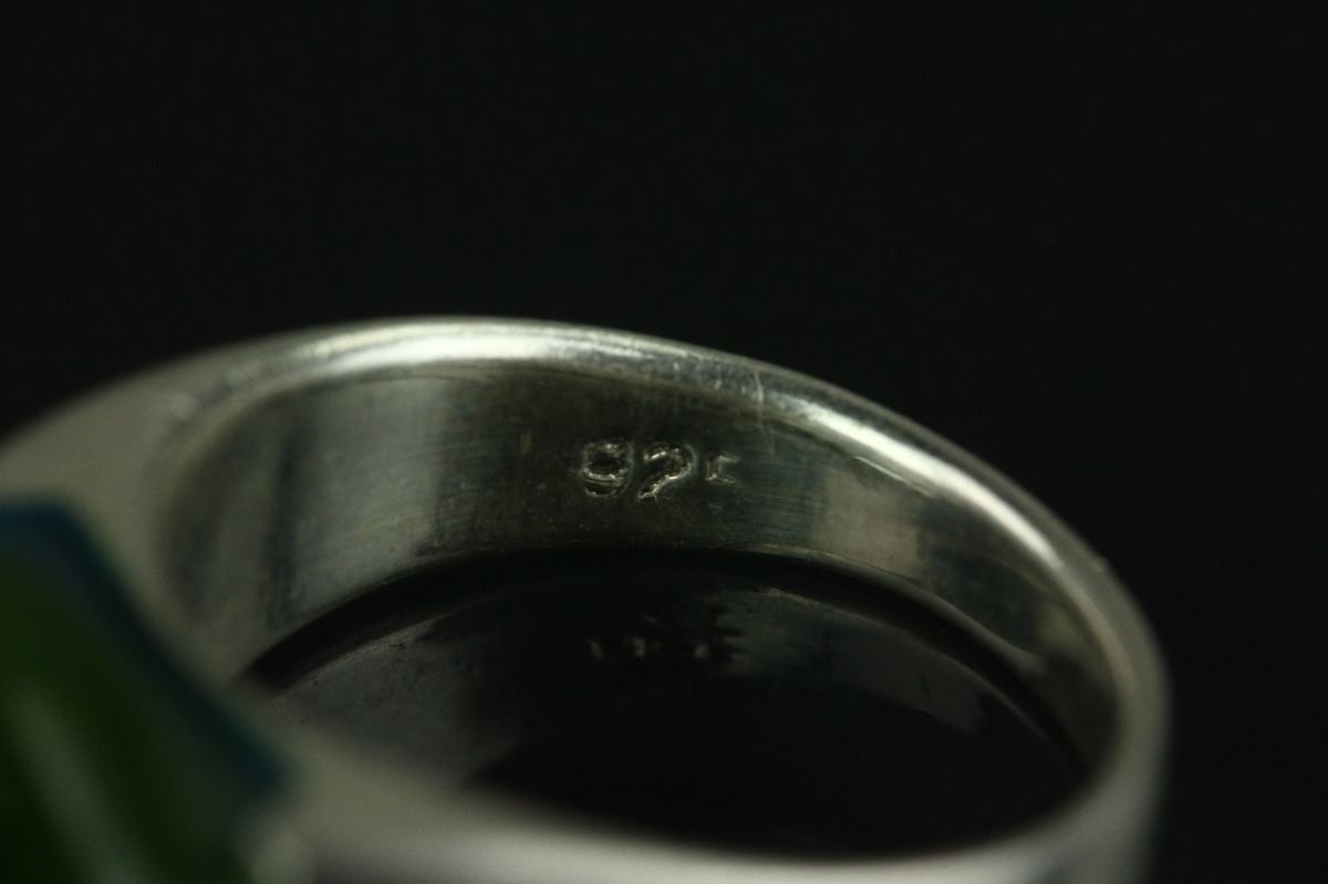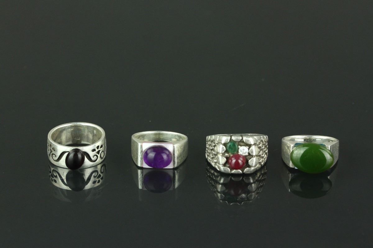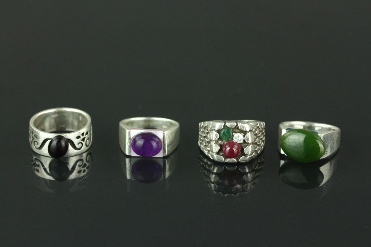 Four pieces of Chinese silver rings; inlaid with various coloured gemstones; with 925 mark on the interior; Ring Size: 8, 6 and 6.5, 23 grams total