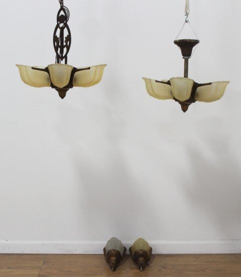 Including 2 chandeliers and pair wall lights. Larger chandelier approx. 17 1/2" H x 15" W. Smaller chandelier approx. 14" H x 14" W. Wall lights approx. 12 1/4" H. (SF684, SS684B, SF684A)