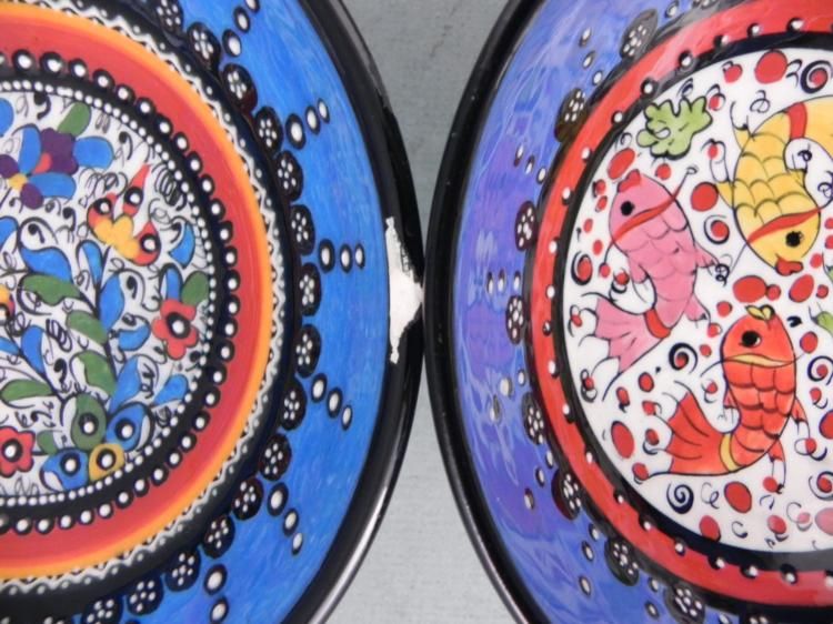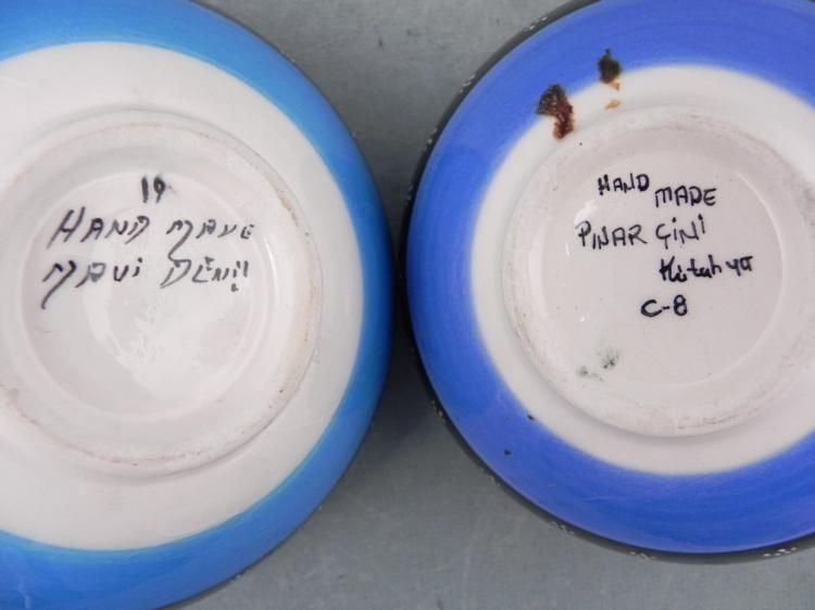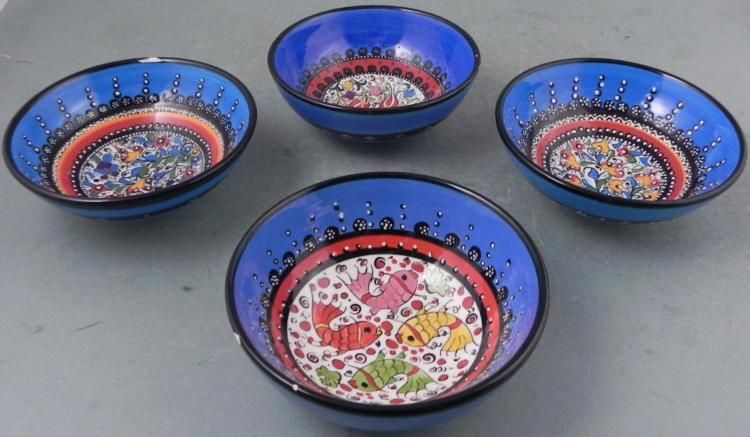 This is a four piece set of Handmade Turkish Iznik pottery bowls from Mavi Deniz. The name, Mavi Deniz means blue sea in Turkish, and these bowls have a beautiful ocean blue, with bright and colorful patterns, with black rims and outlines. The raised white dots make these bowls uniquely stand out. There are two matching floral patterns, one with different flowers, and one with fish. * Markings: On the bottoms, three bowls are marked Mavi Deniz, and another Pinar Cini * Medium: Glazed pottery * Dimensions: 6" in diameter * Condition: Very good to Excellent, three bowls have rim chips