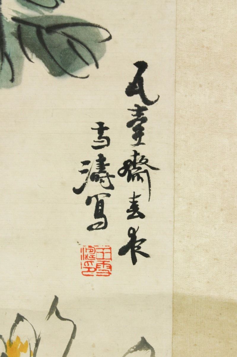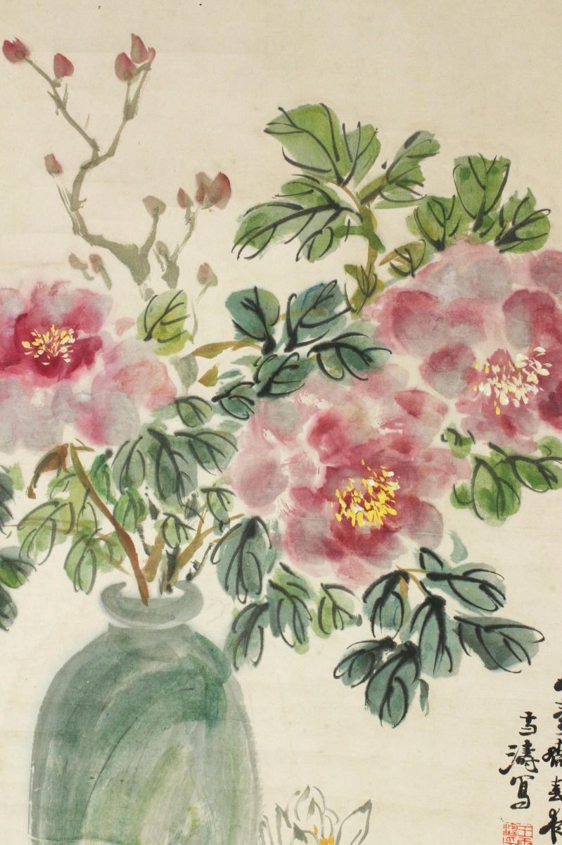 Flowers on vases; Chinese ink and watercolour on paper; four pieces of hanging scroll; signed Wang Xuetao and inscribed with five artist seals; 95 cm X 34.5 cm each