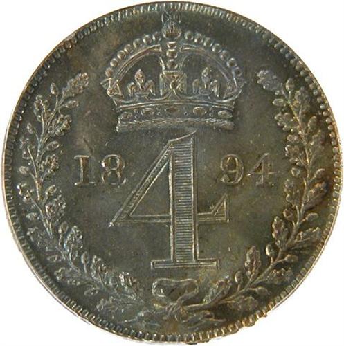 4 Pence Maundy 1894 PCGS MS-67. A superbly lustrous and near flawless example with wonderful toning in medium ambers and blues