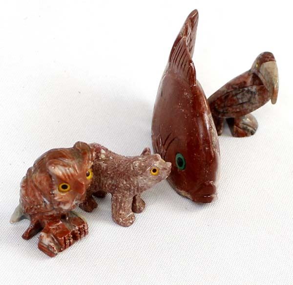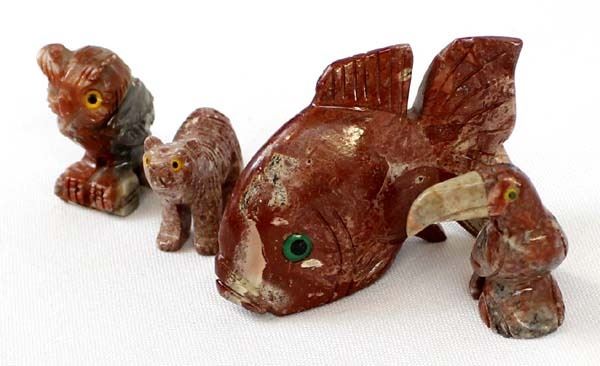 4 Peruvian Carved Stone Animals, largest measures 2.75''L, includes bear, fish, owl, and toucan