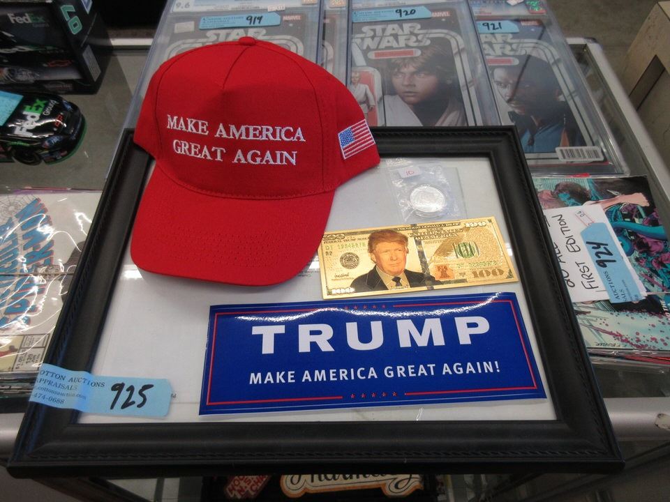 Cap, Bumper Sticker, and Novelty Gold Foil Bill & Trump Coin.