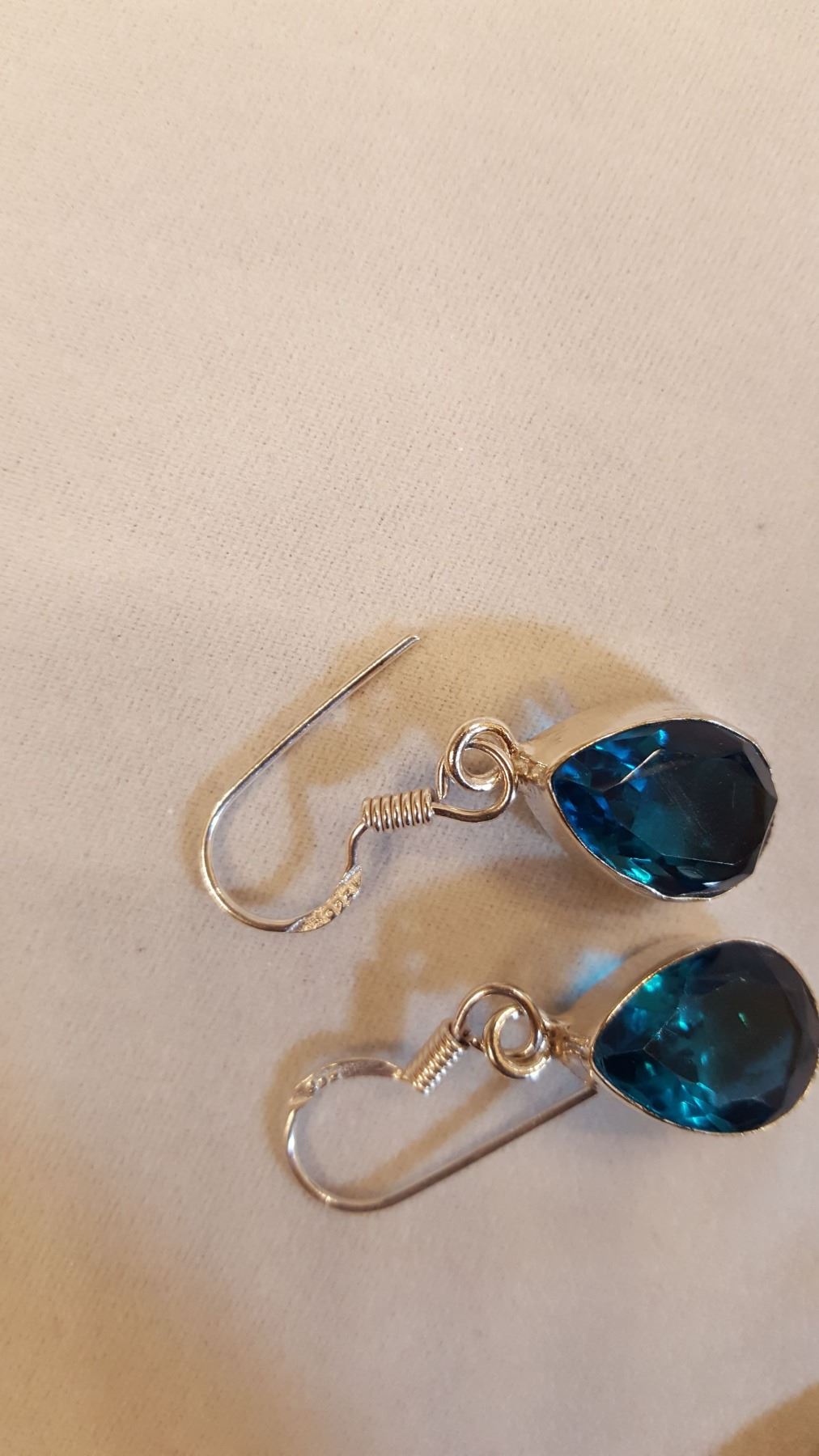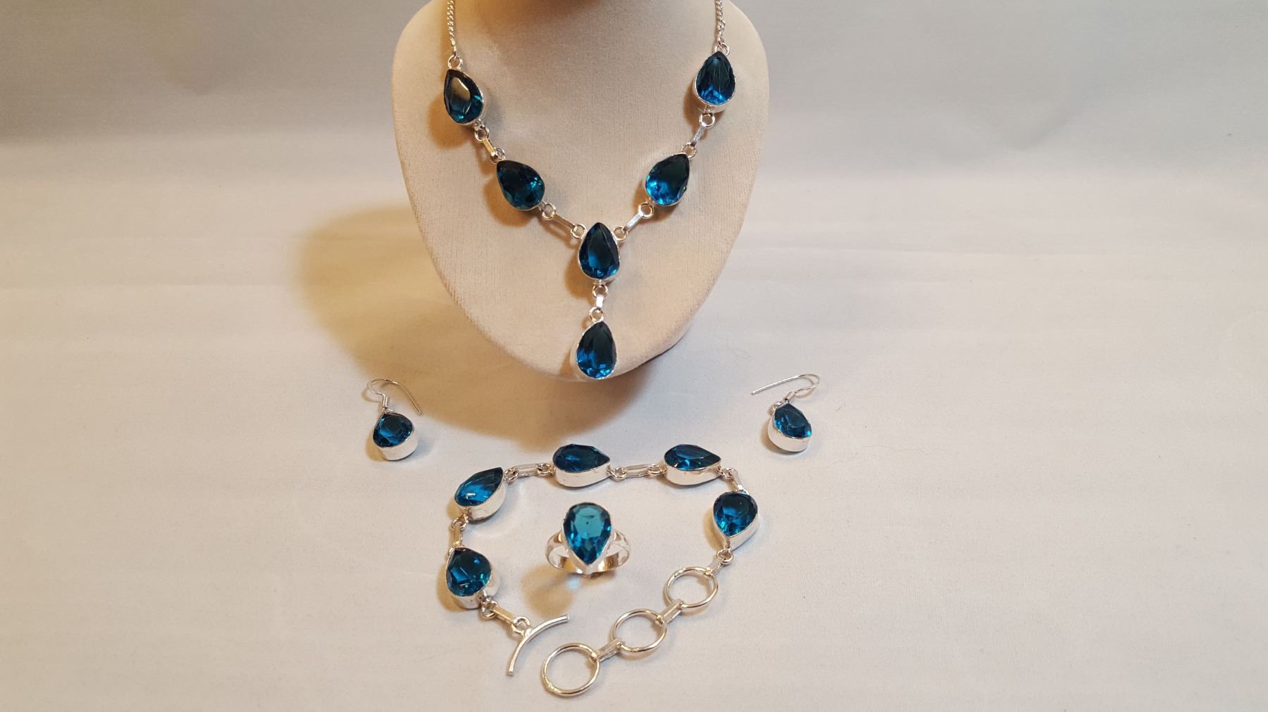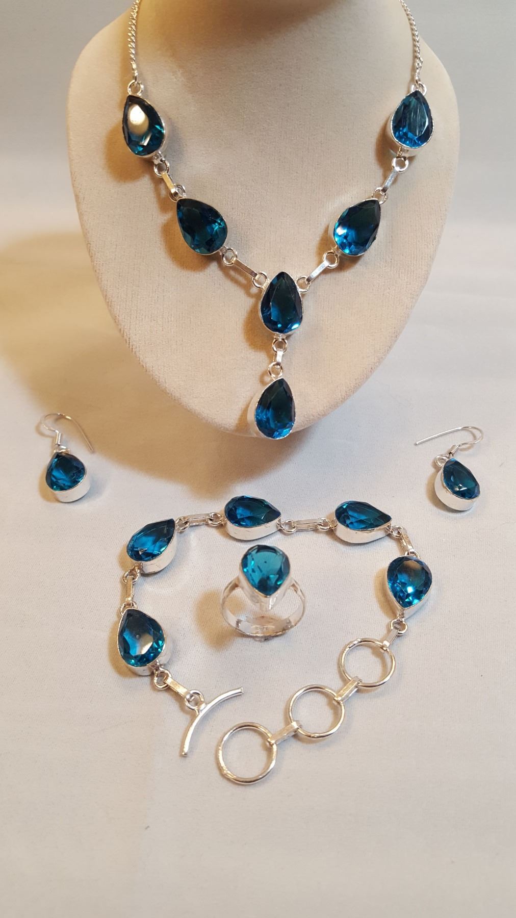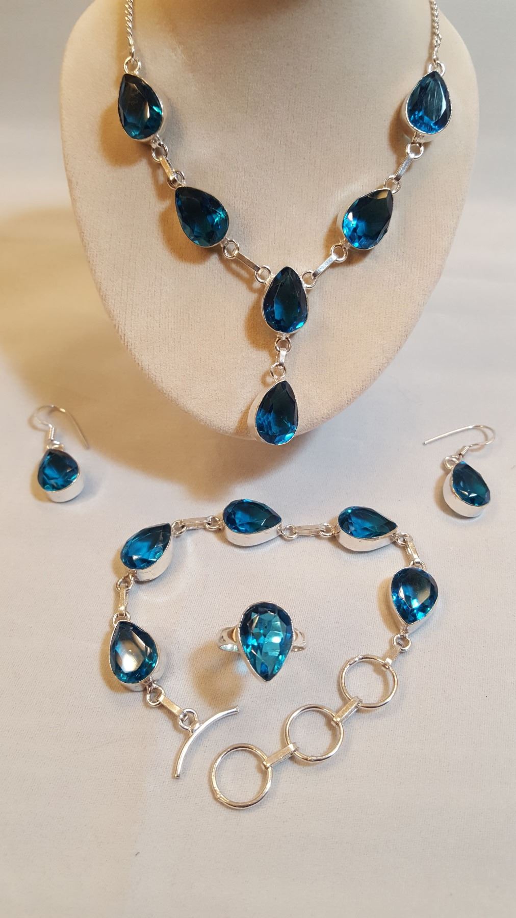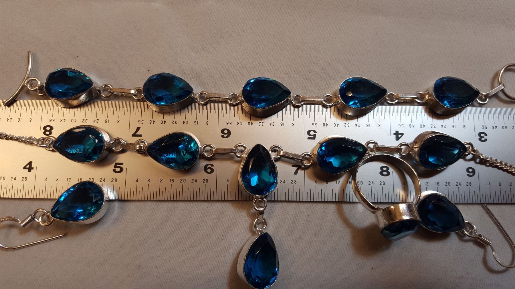 Incredible 4 piece London blue topaz jewelry set. These lab made gemstones are near flawless. They burst out with a dazzling sparkle and vivid even tone. The 4 piece set includes an 18" 35ctw London blue topaz necklace, bracelet, earrings and finger ring size 7 and adjustable. Mounted in .925 sterling silver overlay. Gram total weight approximately 35 grams or for all 4 pieces.