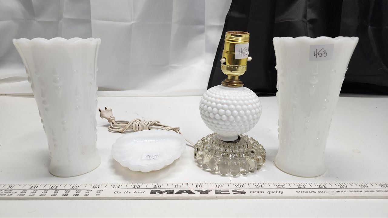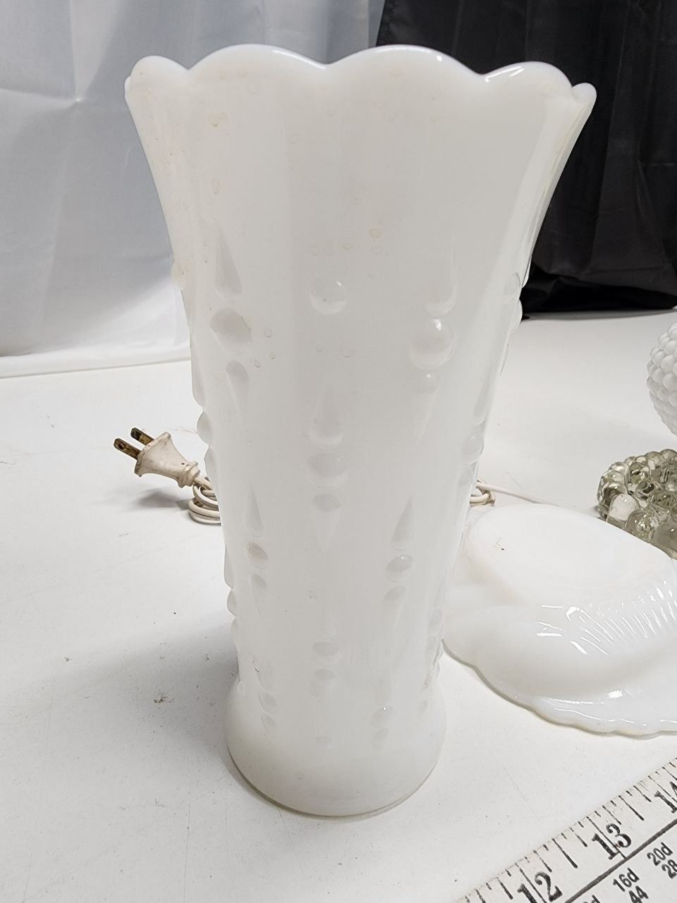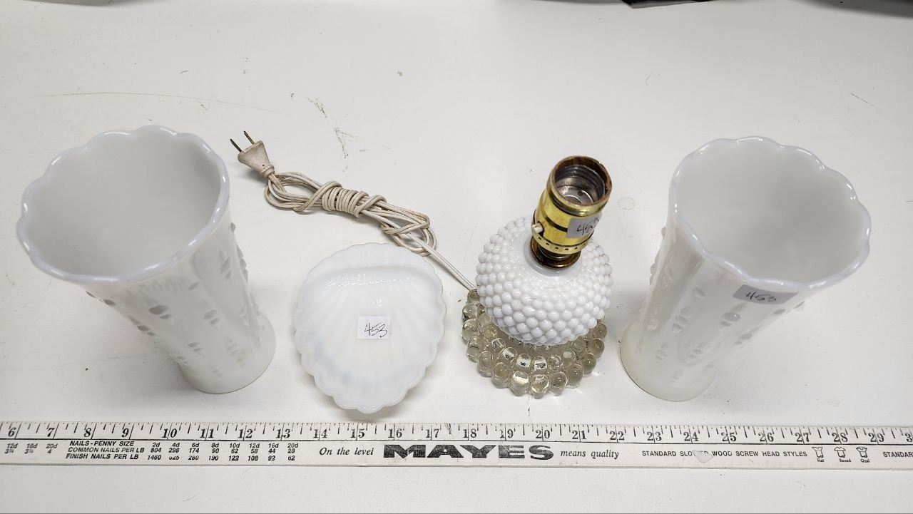 4 Piece Matching, Glass Table lamp, 2 Glass Vases and White Glass Clamshell soap dish