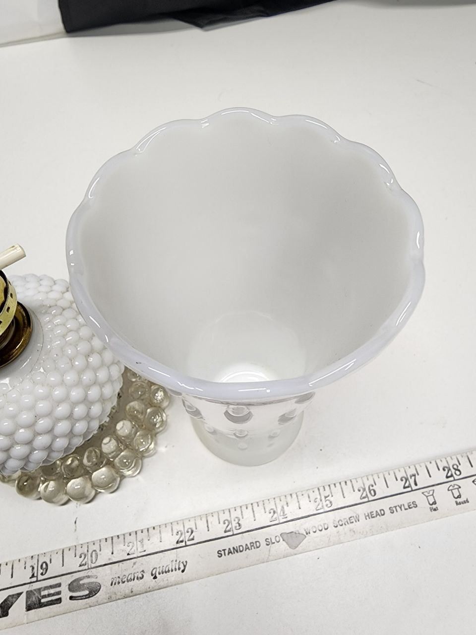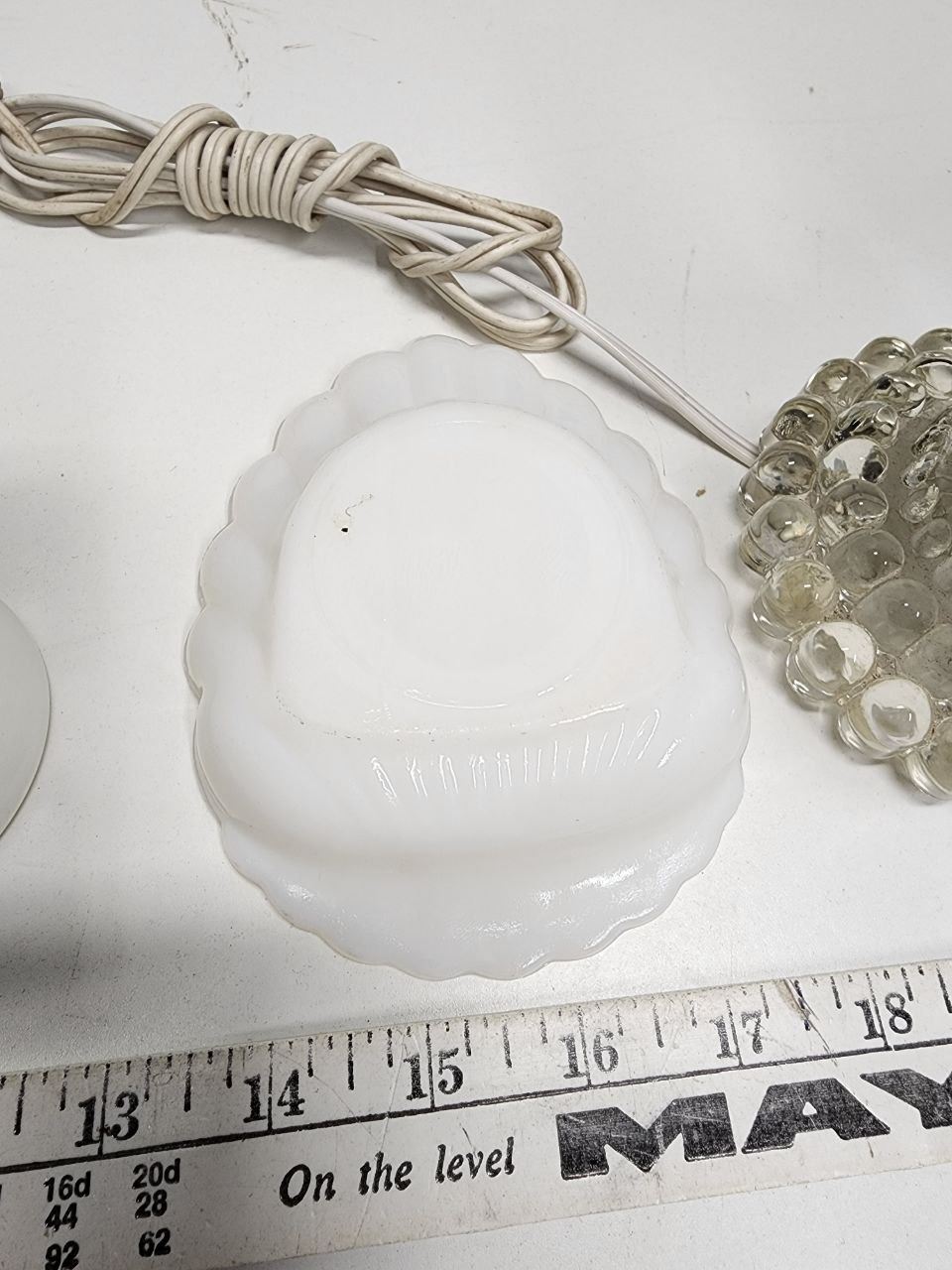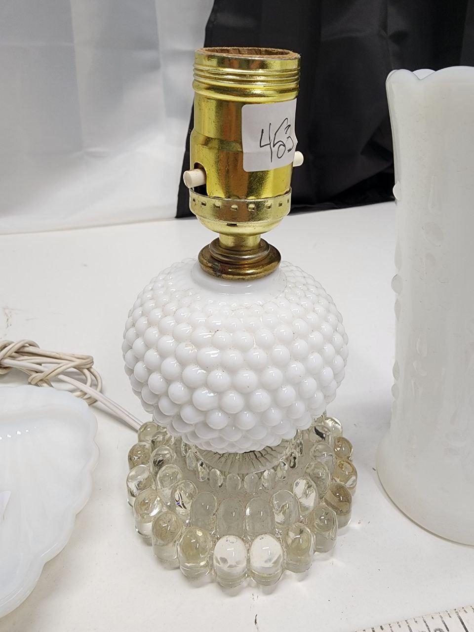 4 Piece Matching, Glass Table lamp, 2 Glass Vases and White Glass Clamshell soap dish