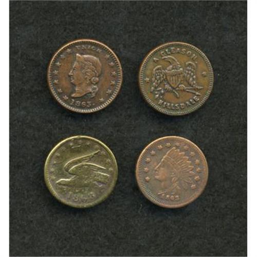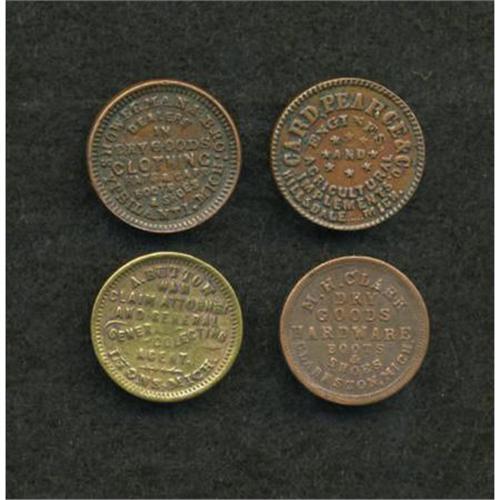 <B>Quartet of Michigan Civil War Merchant Tokens.</B></I> Four Michigan Civil War merchant tokens in a range of grades, <B>Fuld-MI80A-4a, R.6; MI450C-3a, R.8; MI587B-1a, R.7; </B></I>and <B>MI960B-4a, R.8. </B></I><BR><BR><b>Shipping:</b> Coins & Currency (<a target="_blank" href="http://www.heritageauctions.com/common/shipping.php">view shipping information</a>)