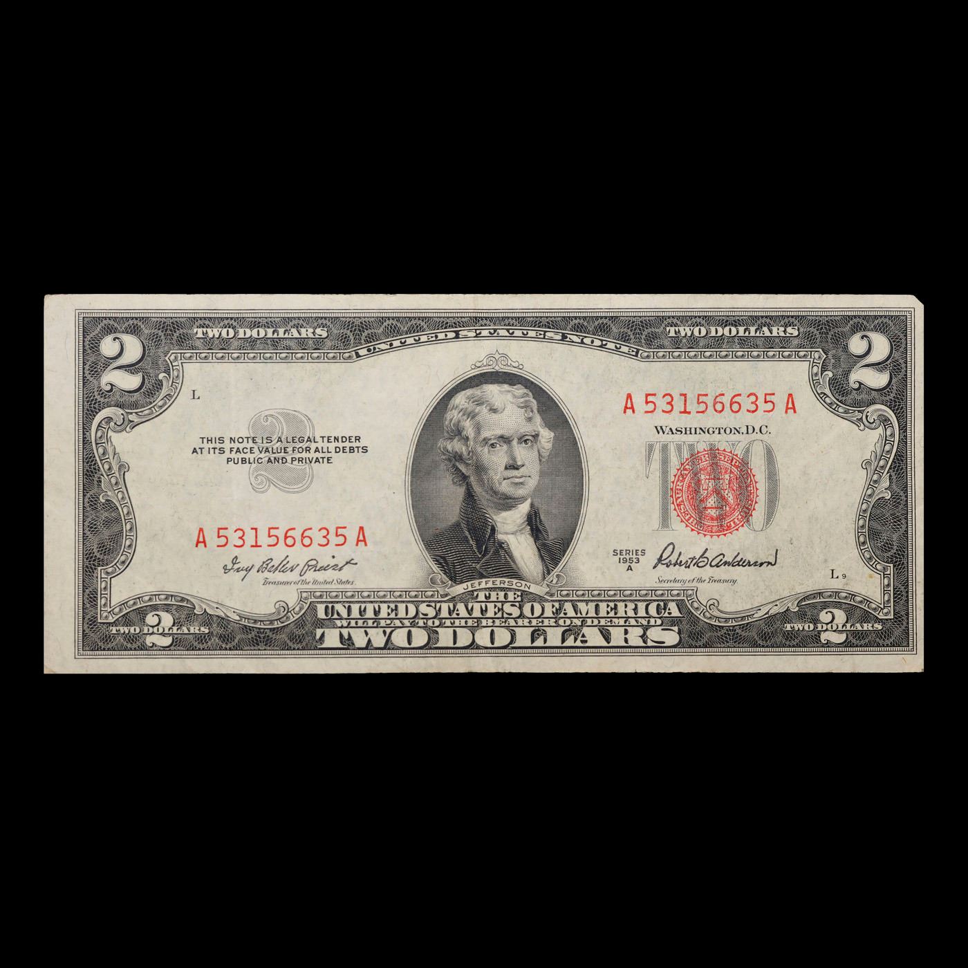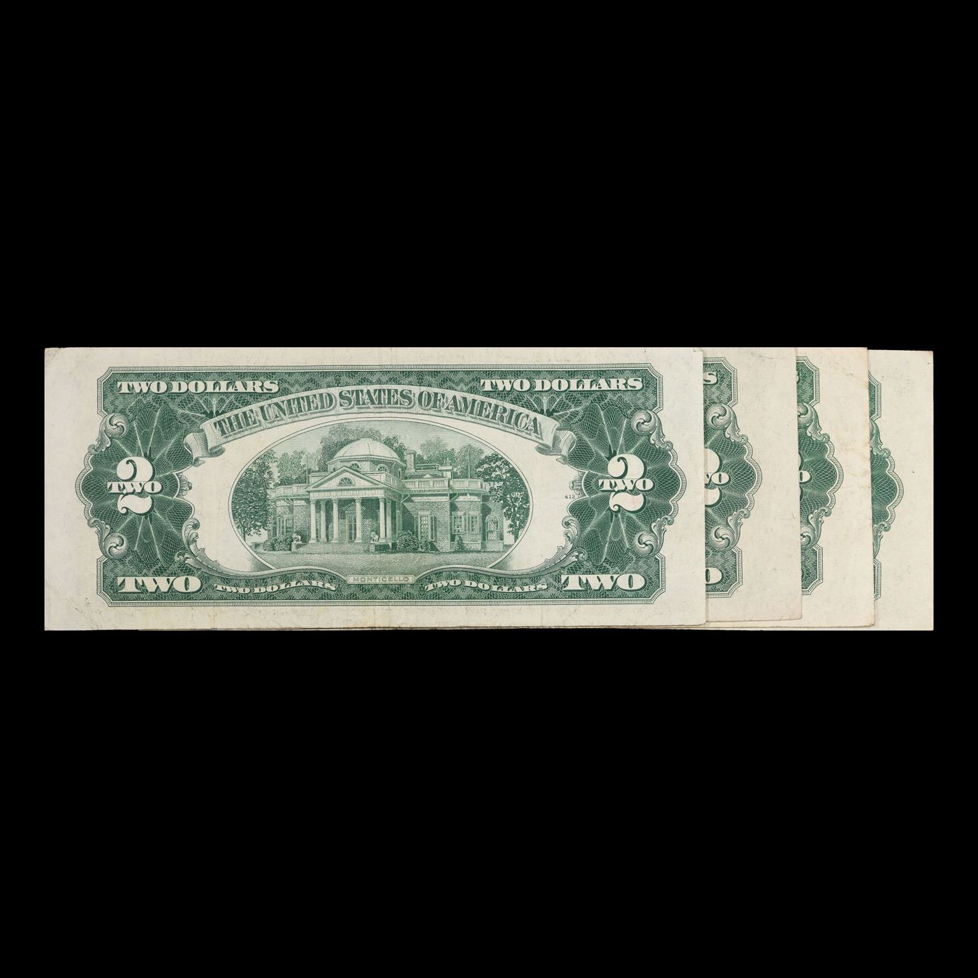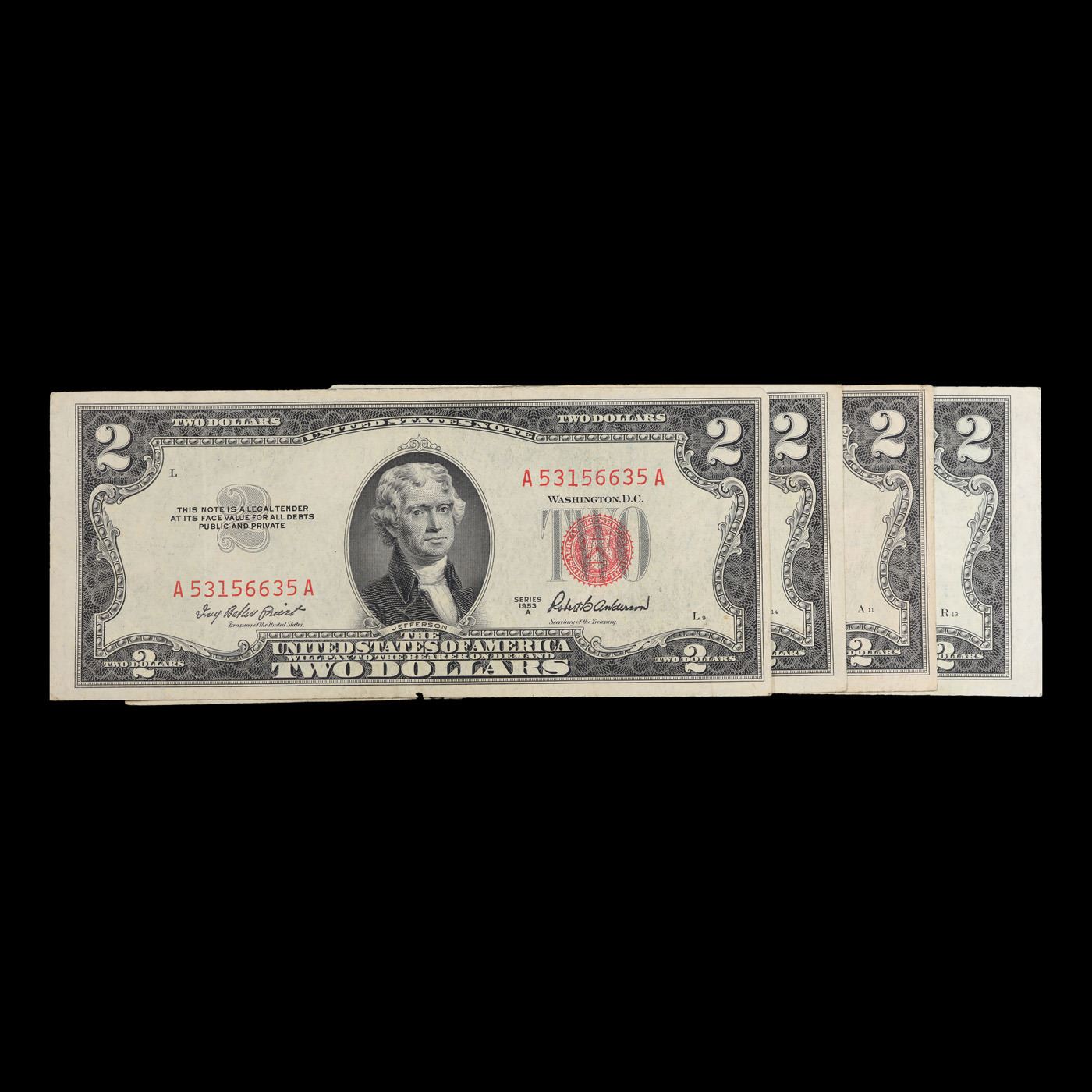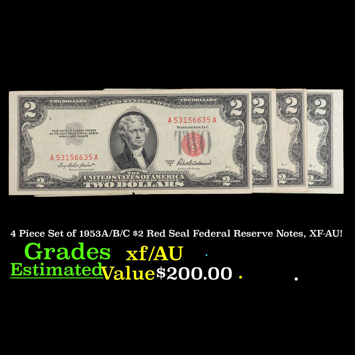 4 Piece Set of 1953A/B/C $2 Red Seal Federal Reserve Notes, XF-AU! Grades XF/AU.