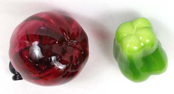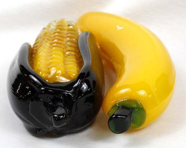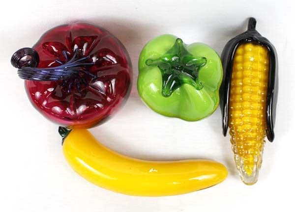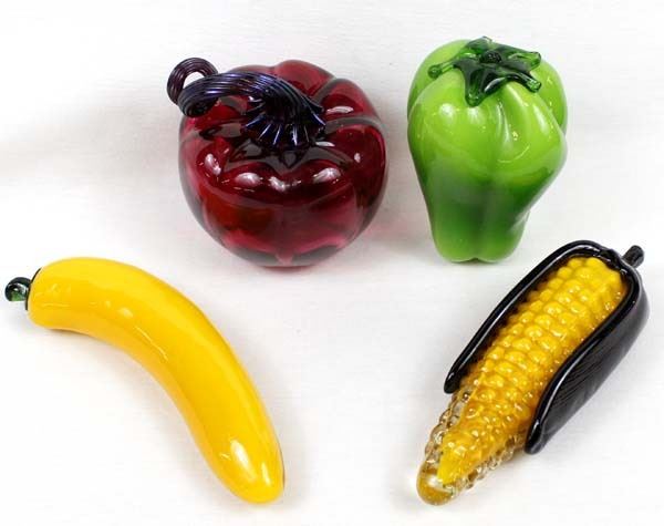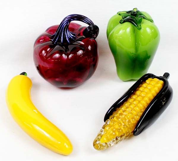 4 Piece Set of Glass Fruit and Vegetables, largest measures 4'' x 5'' and includes a banana, corn on the cob, red bell pepper, and red melon
