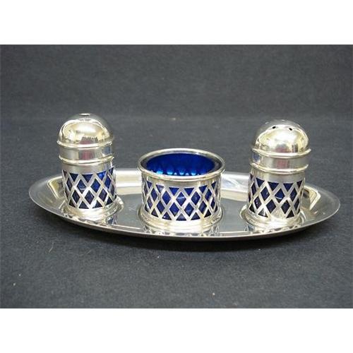 BEAUTIFUL SILVER PLATED SET, CONSISTING OF SALT AND PEPPER SHAKER AND TINY MUSTARD DISH ALL STANDING ON THE OVAL TRAY,EACH PIECE HAS ORIGINAL FINE COBALT BLUE LINER,MADE BY YEOMANS PLATE - ENGLAND,as per picture, Excellent condition,Each shaker stands about 2" high mustard dish stands over 1 1/2" in diam, and over 1" high, tray 6" x 3", US Buyer to pay 8.00 for shipping plus insurance.THANKS.