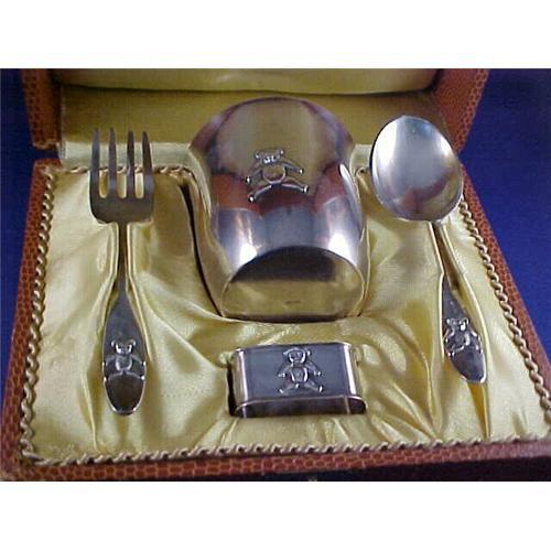 This is an outstanding 4 piece German sterling silver baby set consisting of 3" tall cup or tumbler, 4.5" long fork and spoon, and 1.5" wide napkin ring. Each piece has the cutest raised bear. This set is in its original fitted yellow satin lined leather box. The back of the cup is engraved Fowler Ramsey McManus from John Ramsey Pugh 19 October 1957. The backs of the 3 other pieces are engraved FRMcM. The fork and spoon are marked 800. The cup and napkin ring are marked 835. This set is in excellent condition, but there is considerable wear to the outside of the box (see last photo). Shipping to US addresses is $8.