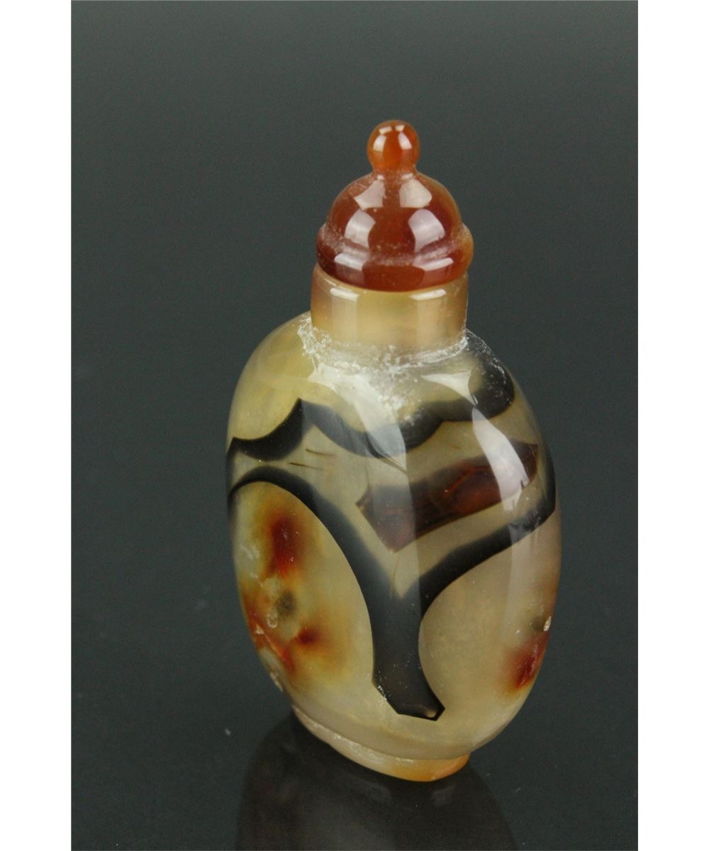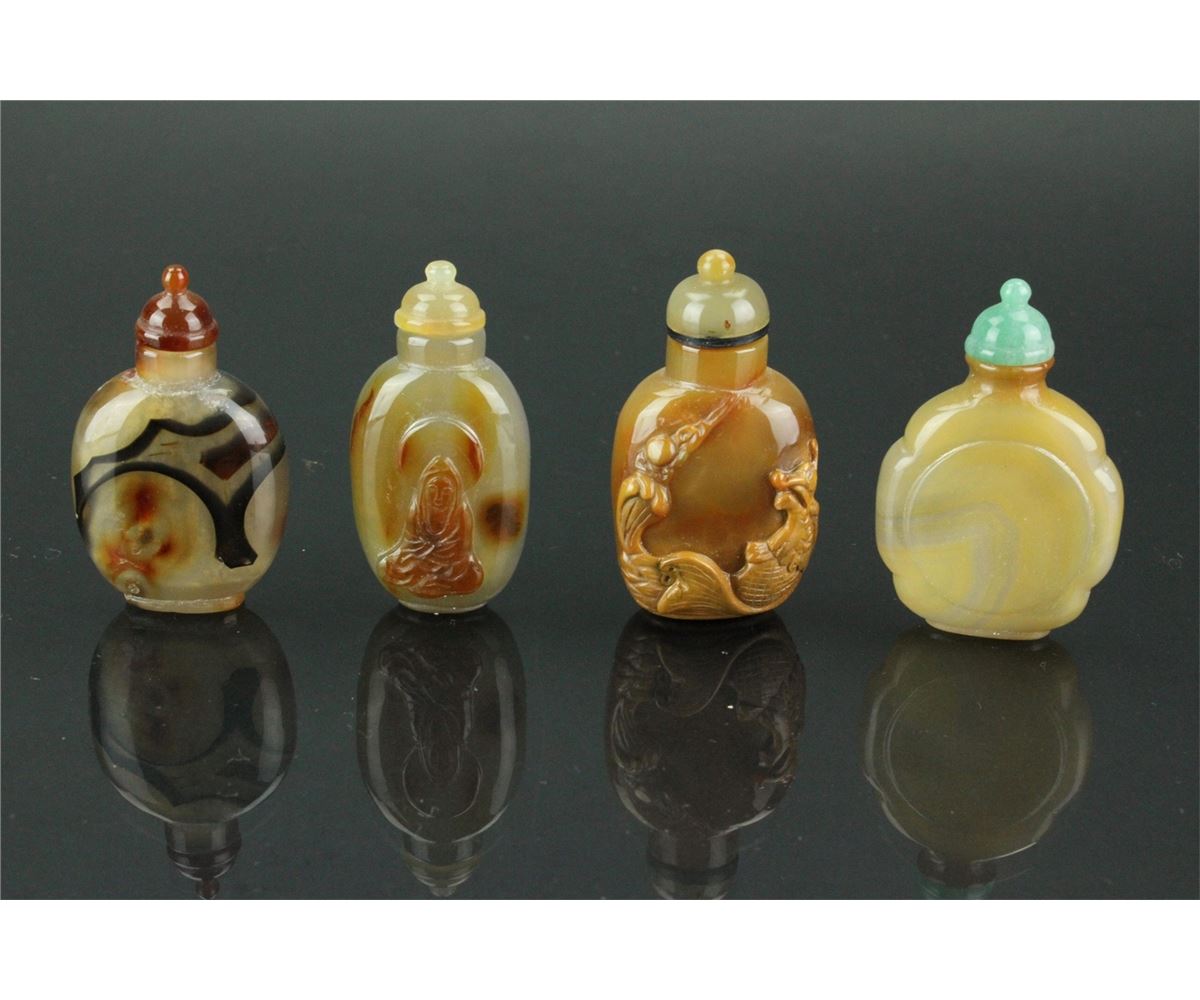 Four pieces of Chinese agate snuff bottles; featuring Guanyin and carps in low relief; of mixed brown tone; H: 6 cm, W: 0.5 cm, L: 4 cm, 111 grams (total)