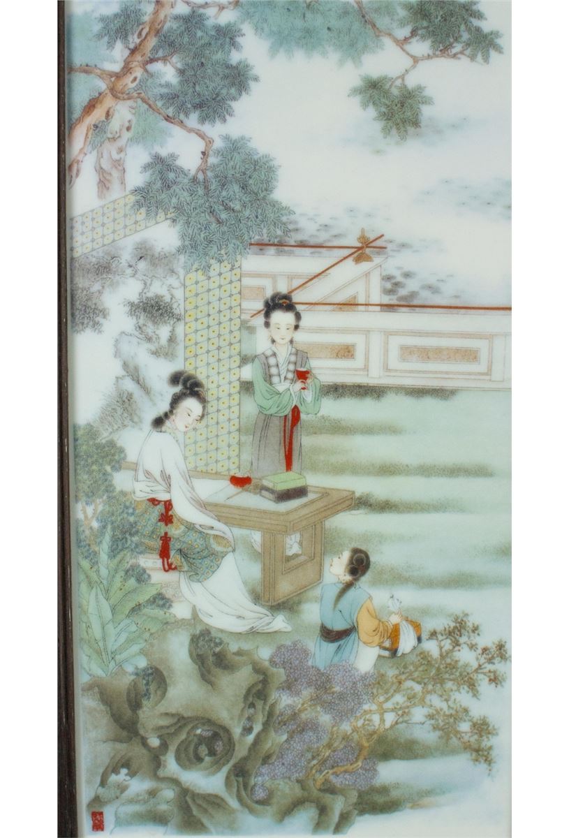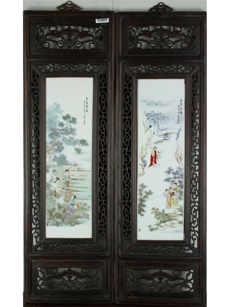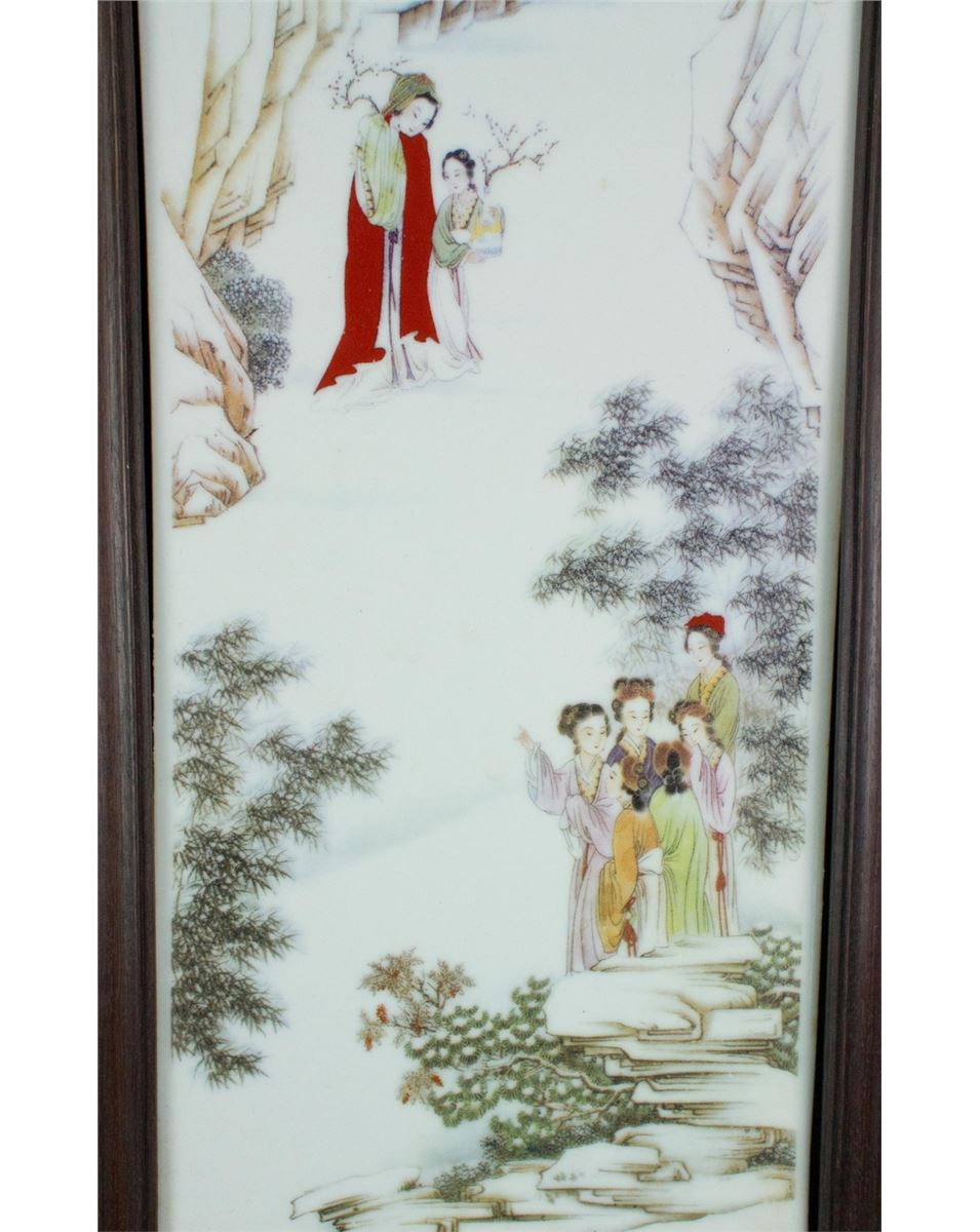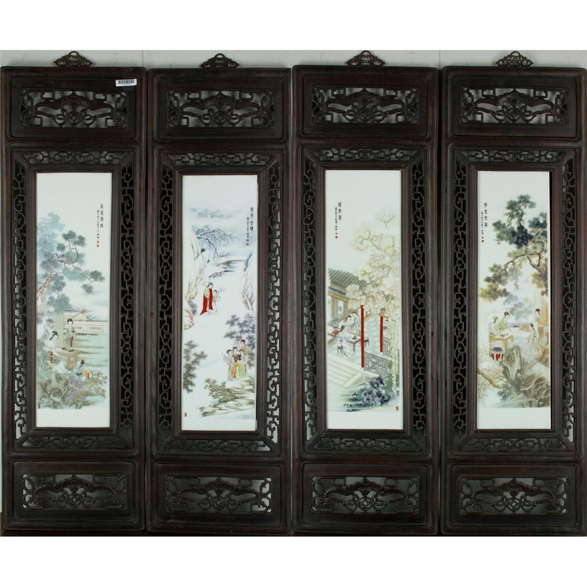 Four pieces of Chinese porcelain panel painted with beauties, with open word wooden frame. H: 97 grams (each), W: 30 cm (each)