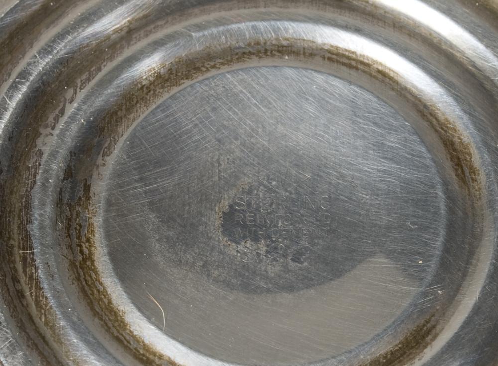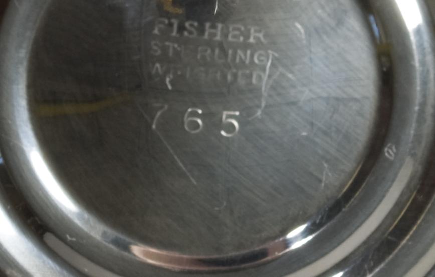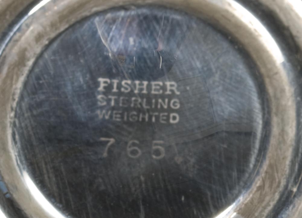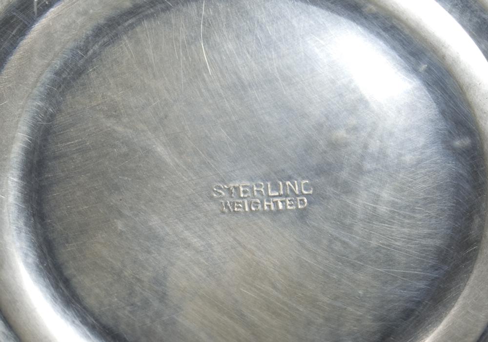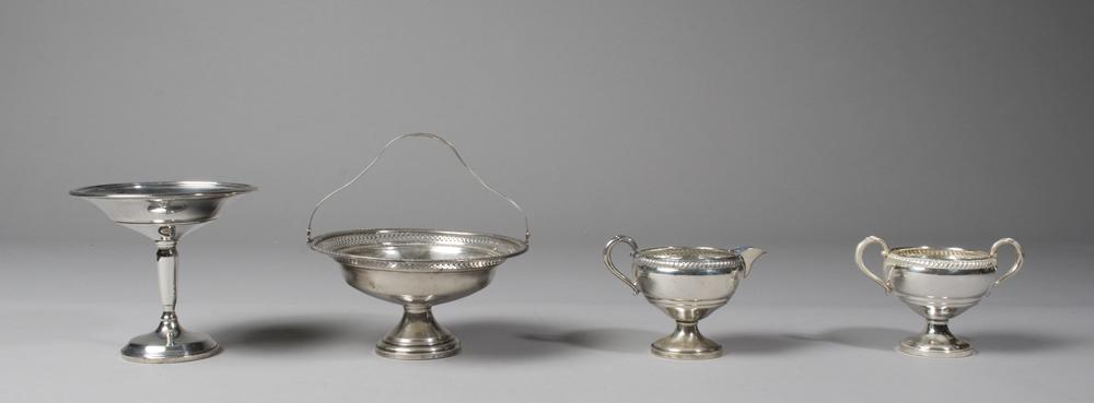 A fisher creamer and sugar bowl, with decorated rim and handles, 3.5" H, a pedestal bowl with reeded rim, 5" H, and a handled pedestal bowl with pierced decoration, 6.5" D, 17.5 troy ounces weighted total weight.