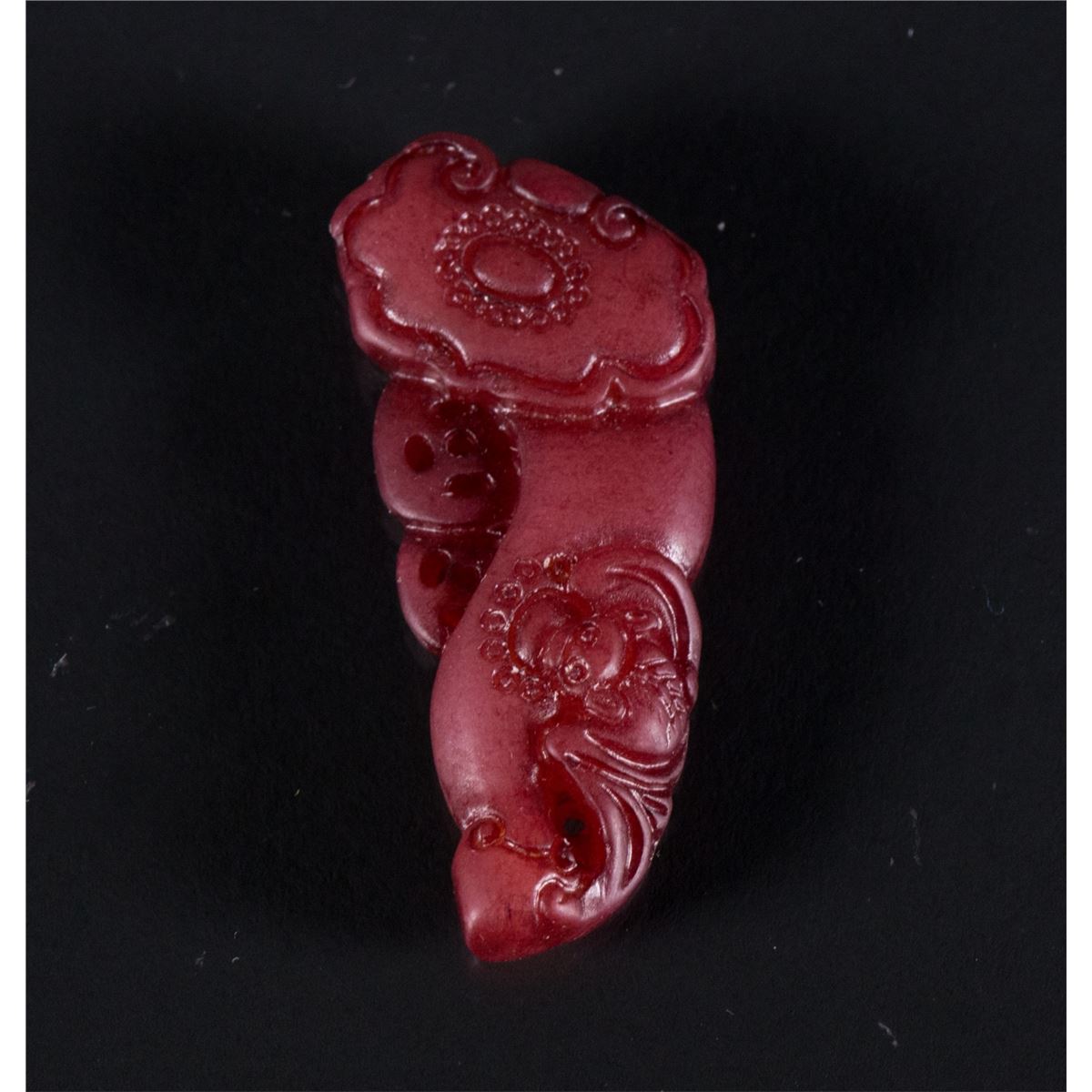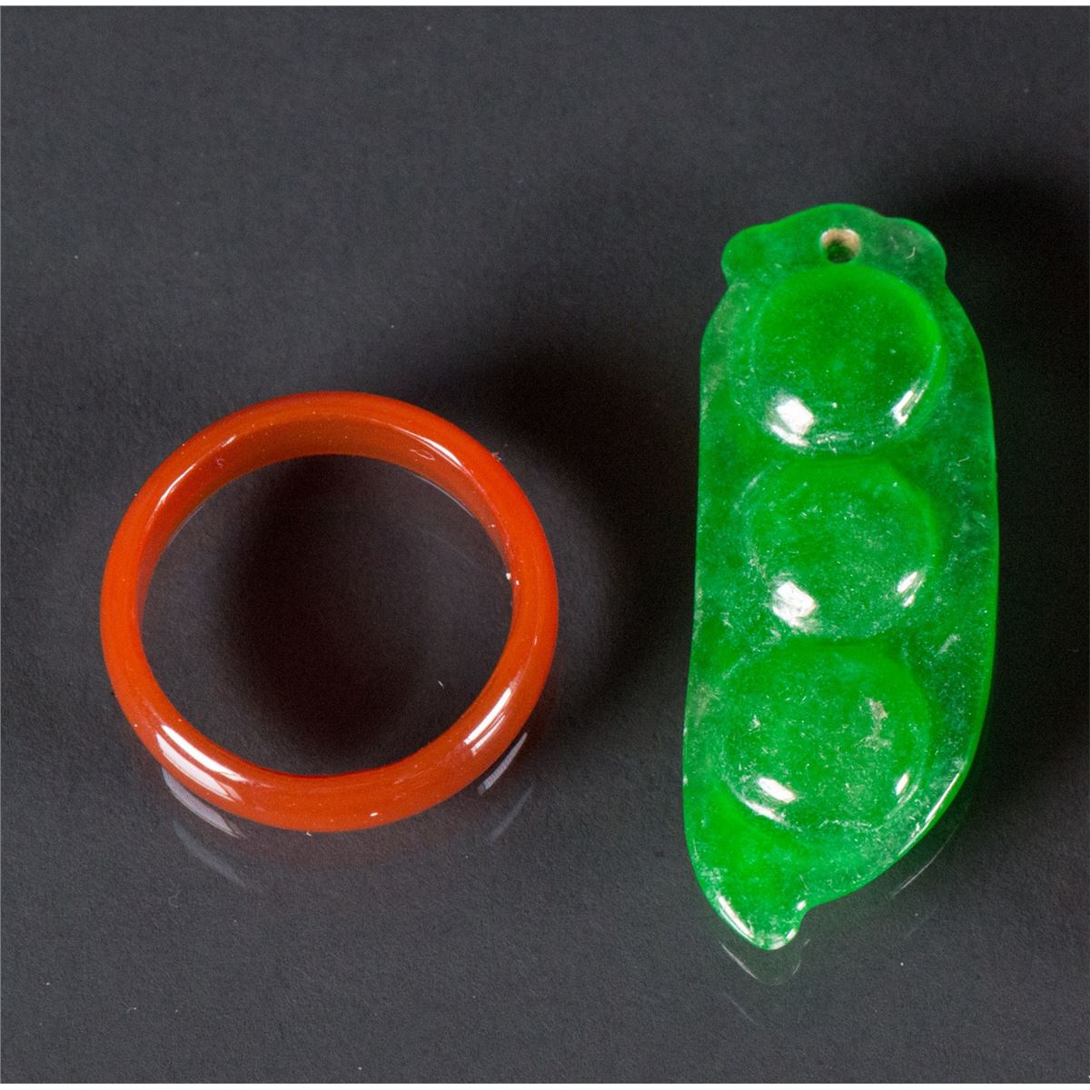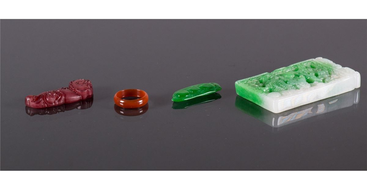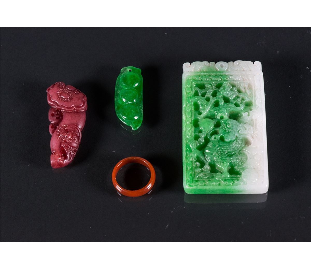 Four pieces of Chinese jade and agate pendants; comprised of a carved dragon square pendant, a purple Ruyi pendant, an emerald green bean pendant and a russet ring; H: 7 cm, W: 4 cm, 69 grams total