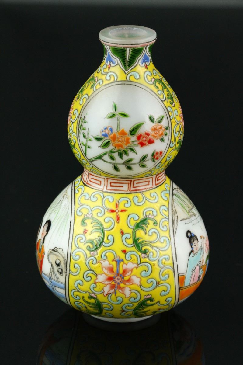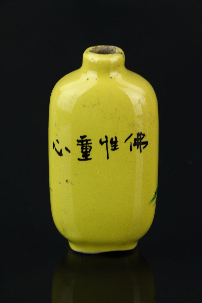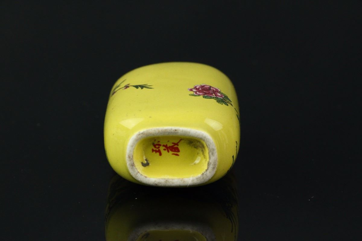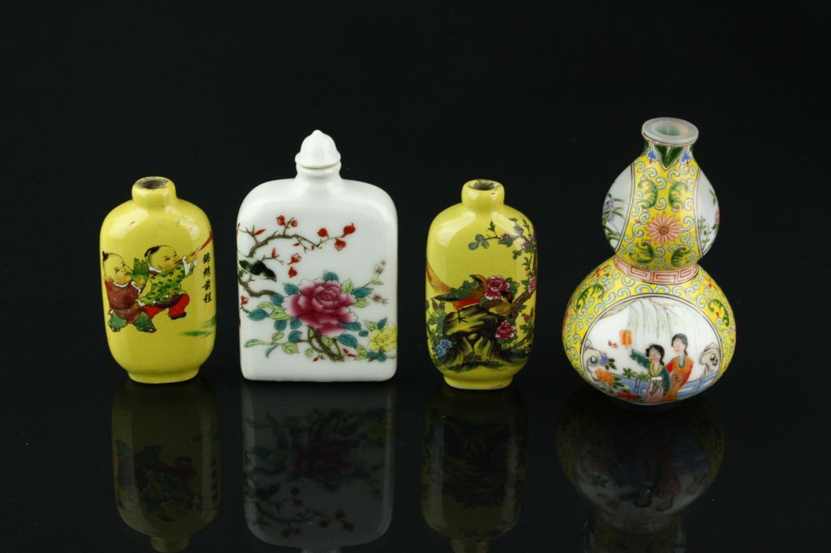 Four pieces of Chinese snuff bottles; comprised of three Famille Rose porcelain snuff bottles and one Peking glass snuff bottle; featuring figures and flowers on yellow ground; marks on base; H: 10 cm, W: 6 cm, 268 grams total