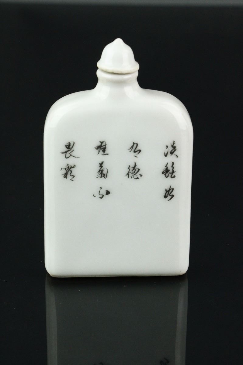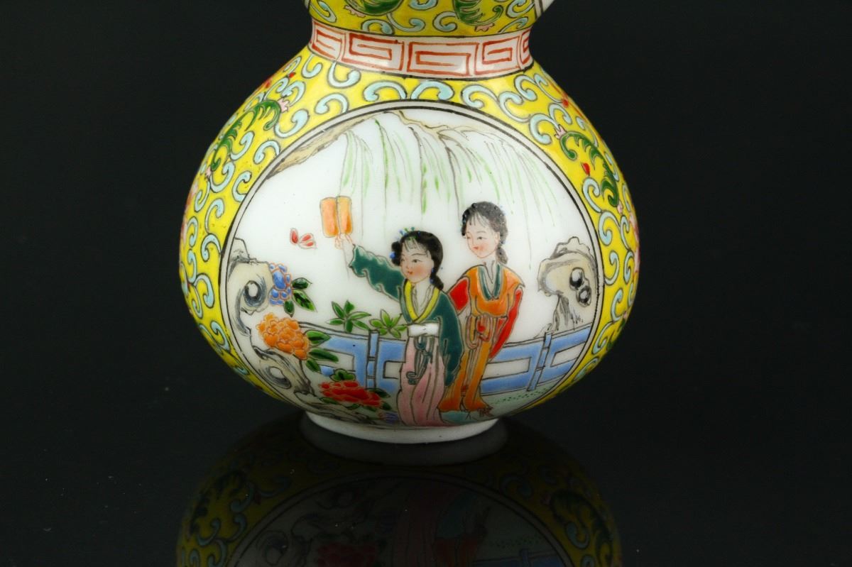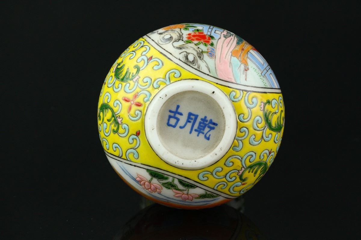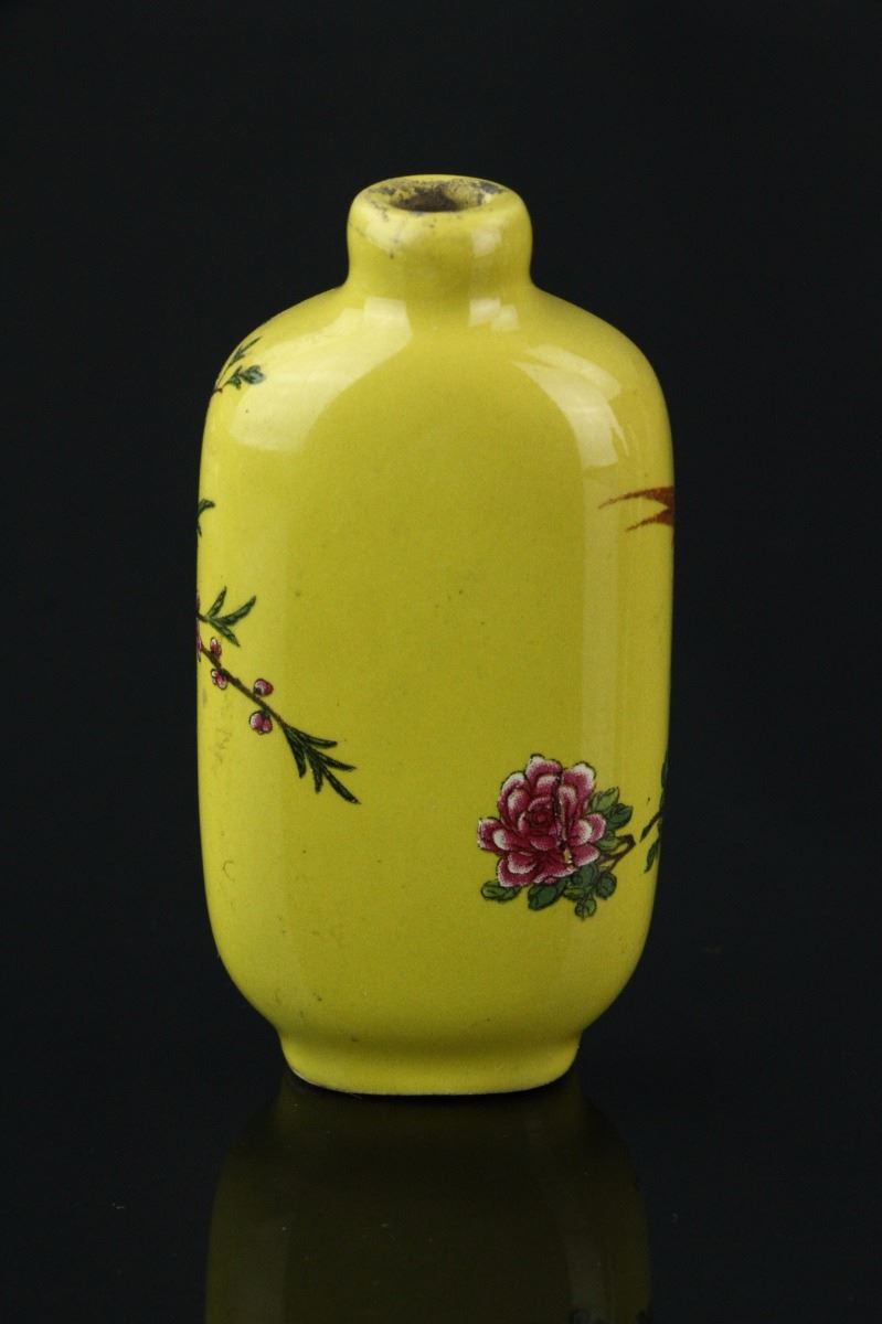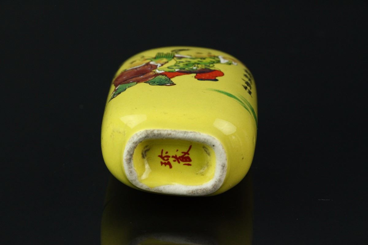 Four pieces of Chinese snuff bottles; comprised of three Famille Rose porcelain snuff bottles and one Peking glass snuff bottle; featuring figures and flowers on yellow ground; marks on base; H: 10 cm, W: 6 cm, 268 grams total