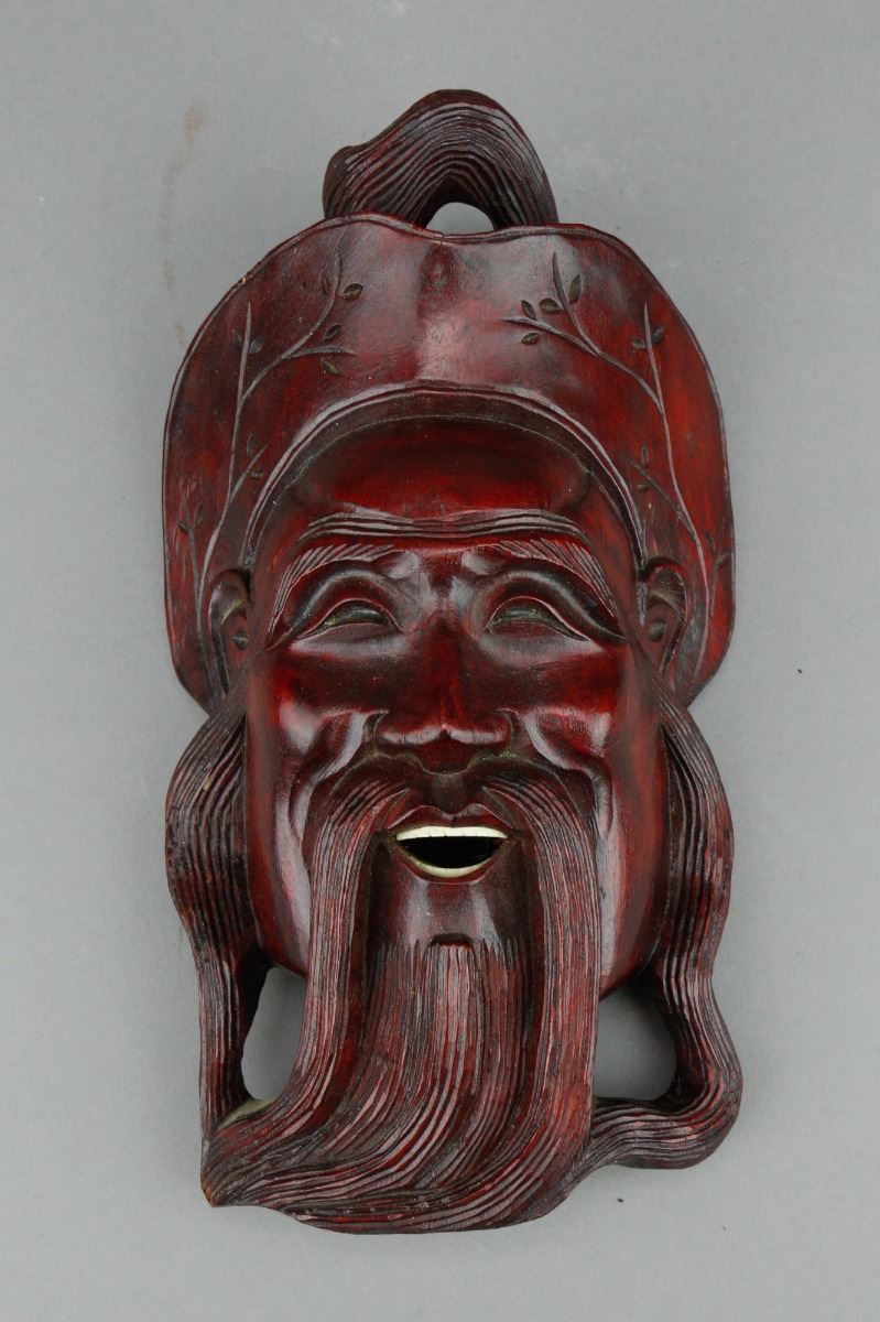 Four pieces of Chinese wood mask;featuring faces of a lady, a man with crown and two old men; H: 23 cm, W: 16 cm, 2481 grams
