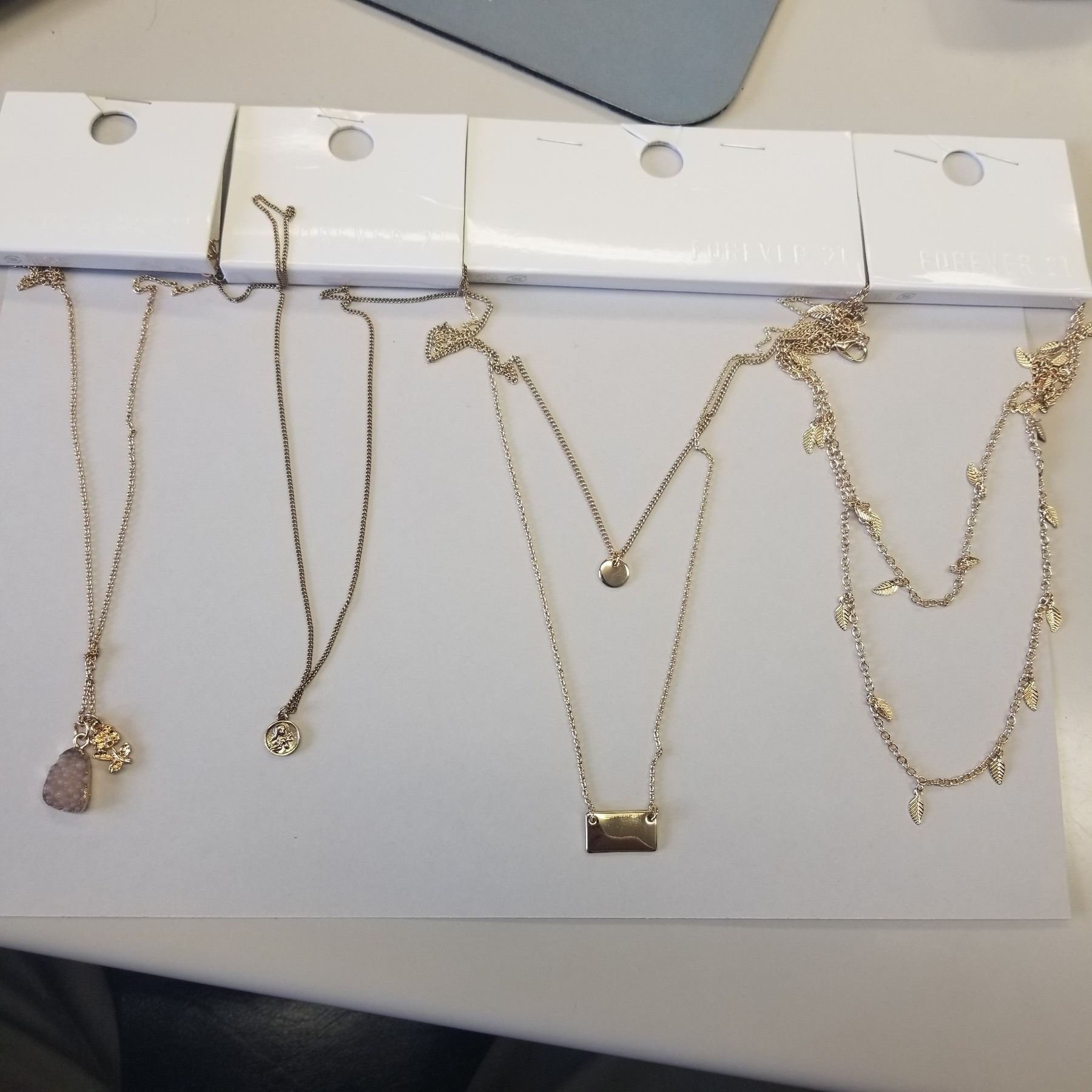 4 Pieces of Forever 21 Fashion Jewelry Rose Pendent with Stone, Saint Pendent, Small Circle and Rectangle (double Chain) , Chain with gold(colour) Leafs