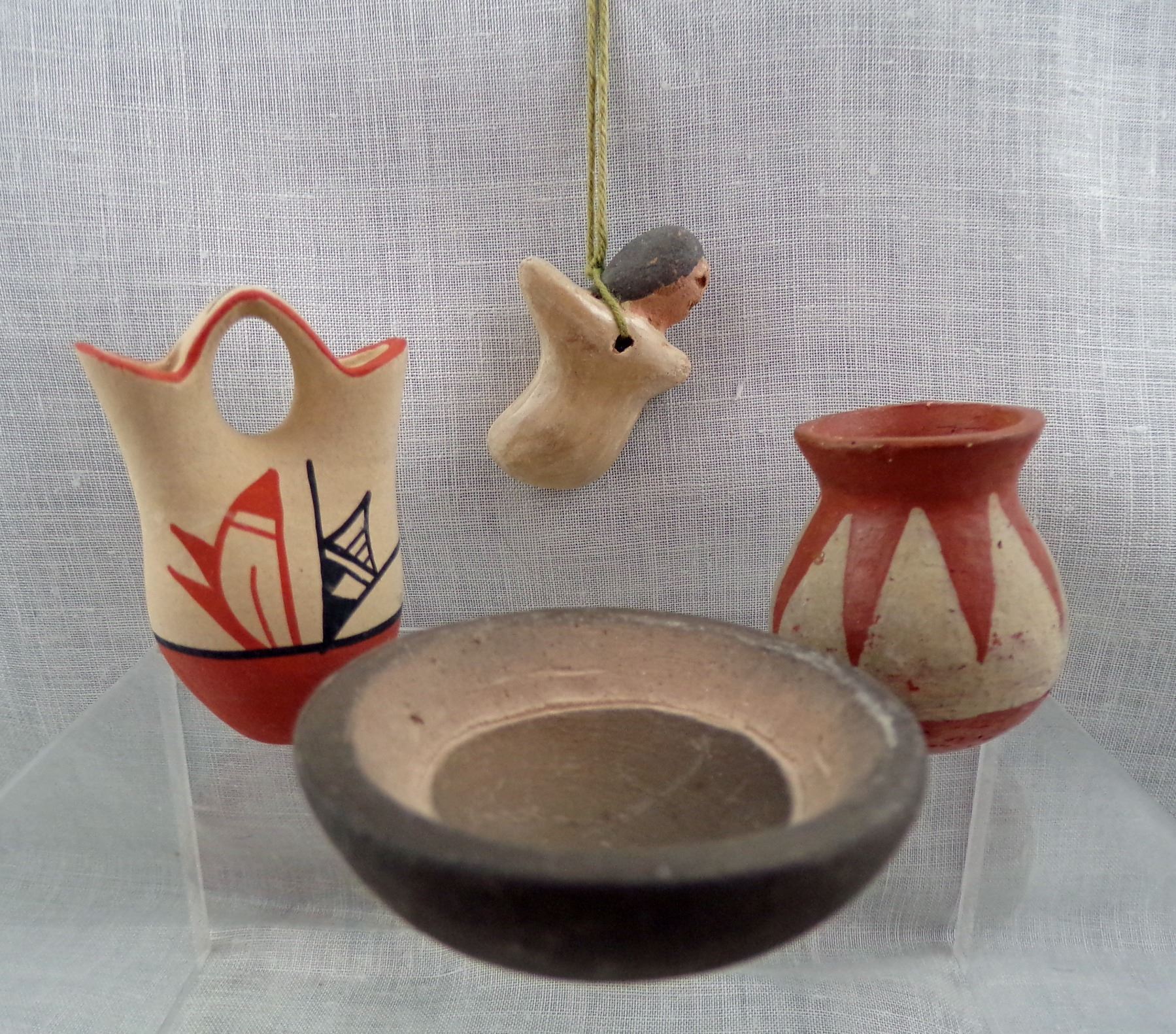 4 Pieces of Native American and Mexican Miniature Pottery, includes Jemez, Catawba, Cochiti, and Tarahumara, largest measures 1''