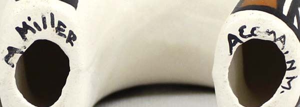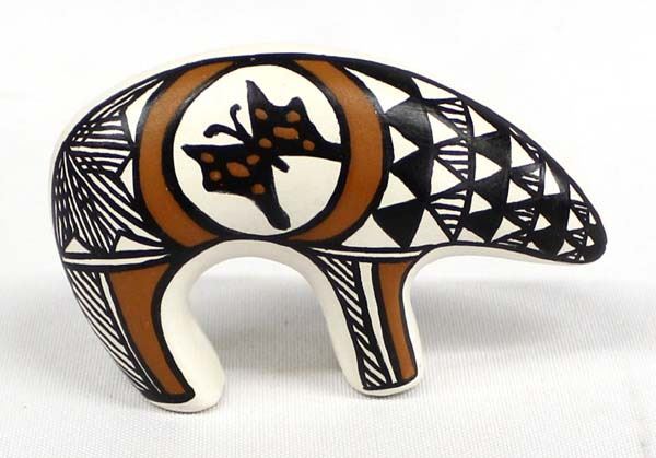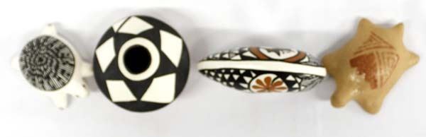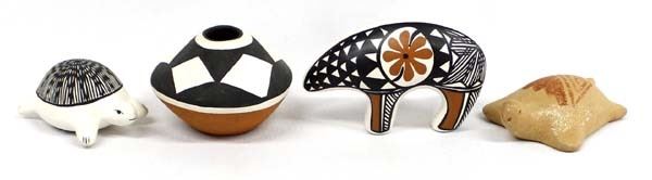 4 Pieces of Native American Pottery, includes 1. Acoma Pottery Seed Jar measuring 2.75'' x 2'' 2. Acoma Painted Ceramic Bear by M. Miller, measures 3.5'' x 2 3/8'', signed on the bottom 3. Acoma Painted Ceramic Turtle, signed on the bottom 4. Nambe' Micaceous Clay Turtle, artist's initials BL on the bottom, measures 2.5'' x 3''