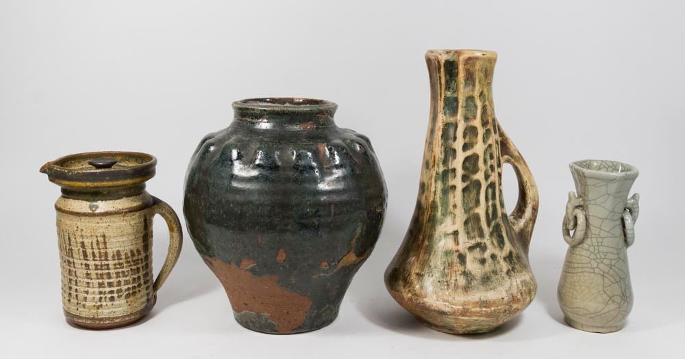 Including Chinese celadon crackle finish vase, modern urn, pitcher, and covered pitcher. Various sizes.