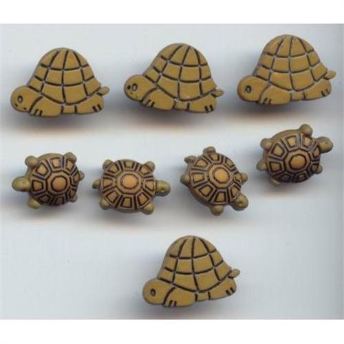 This grouping of adorable plastic turtles consists of 4 buttons and 4 flat glue on decorations (also good for scrapbooking . I purchased these from a veteran seamstress who was cleaning out her warehouse! They are never used and the larger measure 1/2 inch tall and the smaller buttons are 3/8ths inches tall and 5/8ths inches wide. The buttons have a U shaped plastic shank on the back.