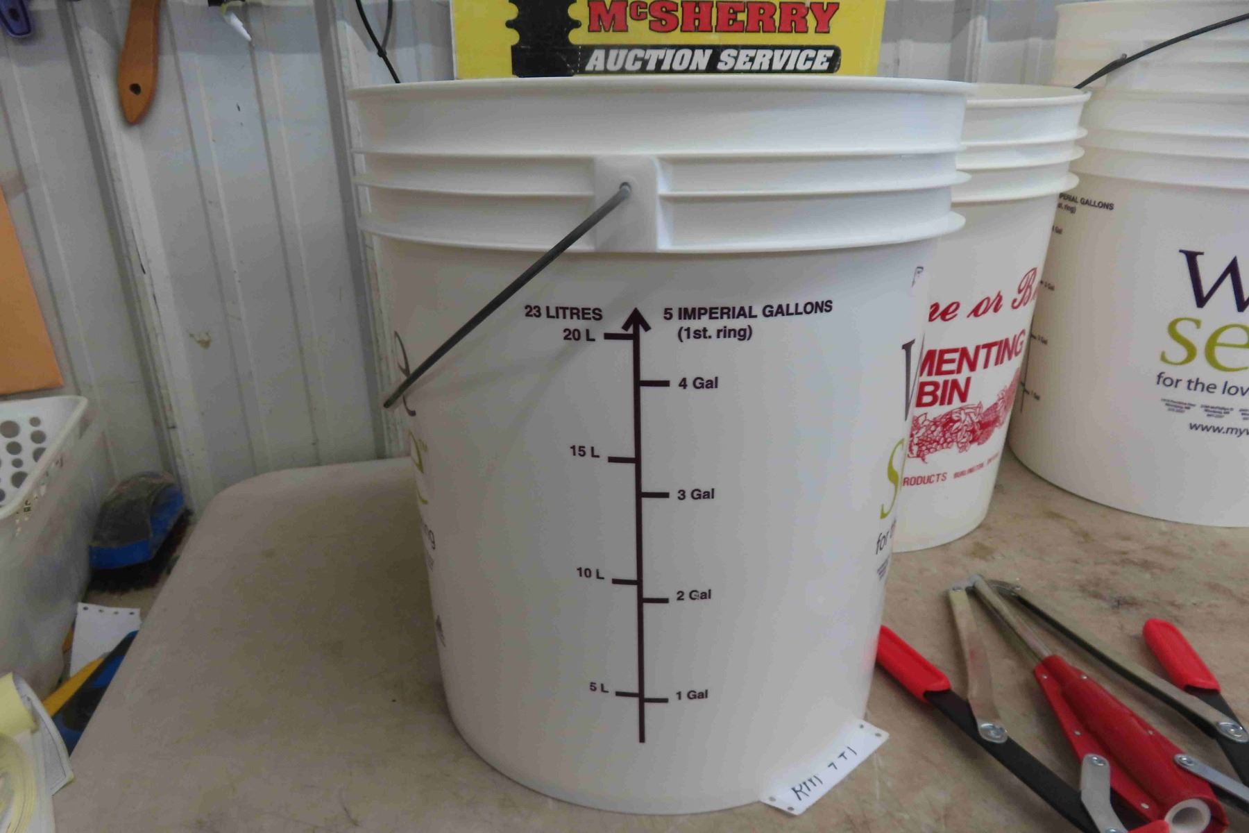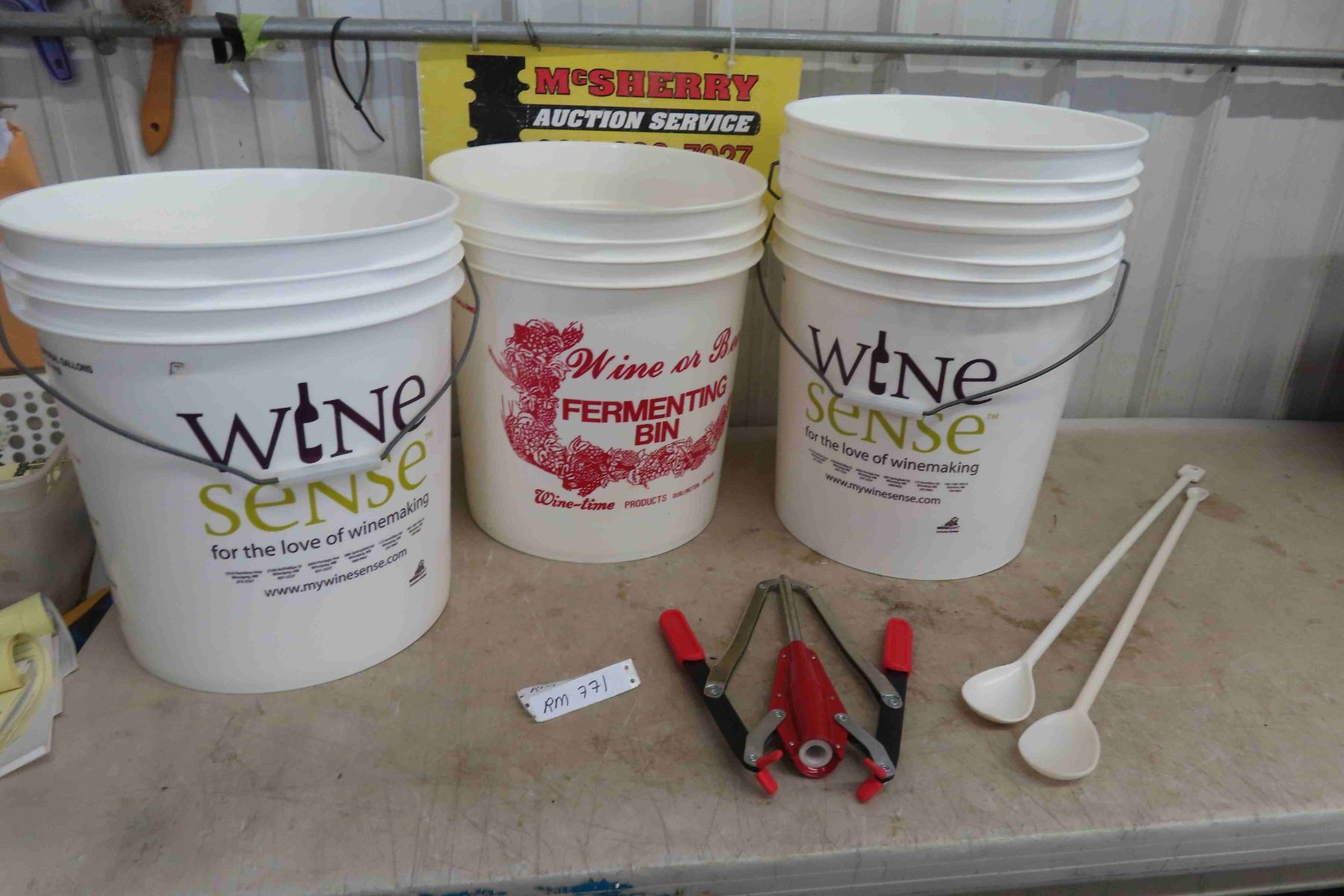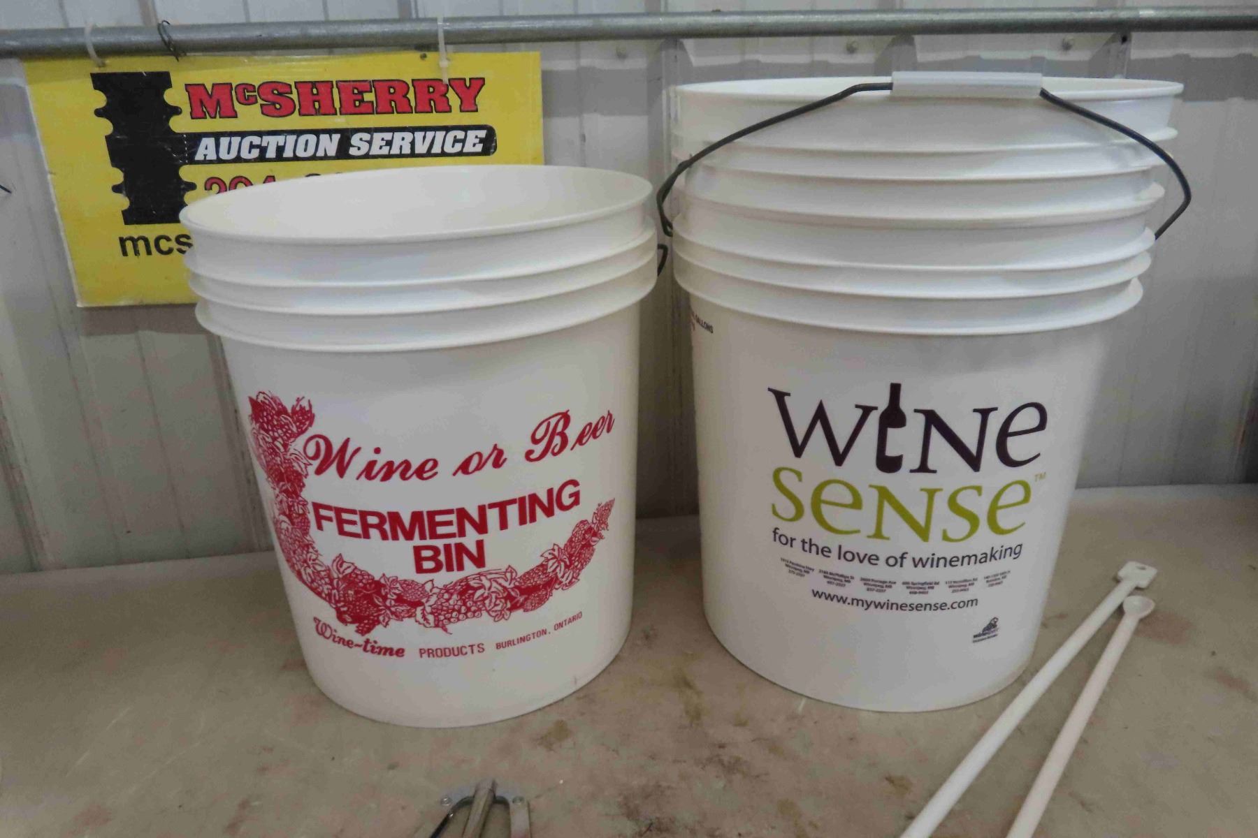 4 Plastic Wine / Beer Making 5 Gallon Pails, Stirring Spoons + Corker