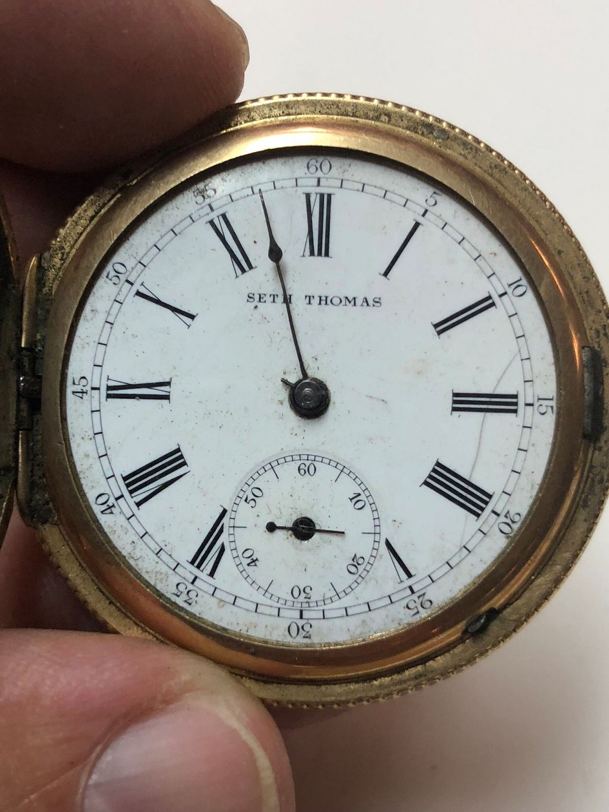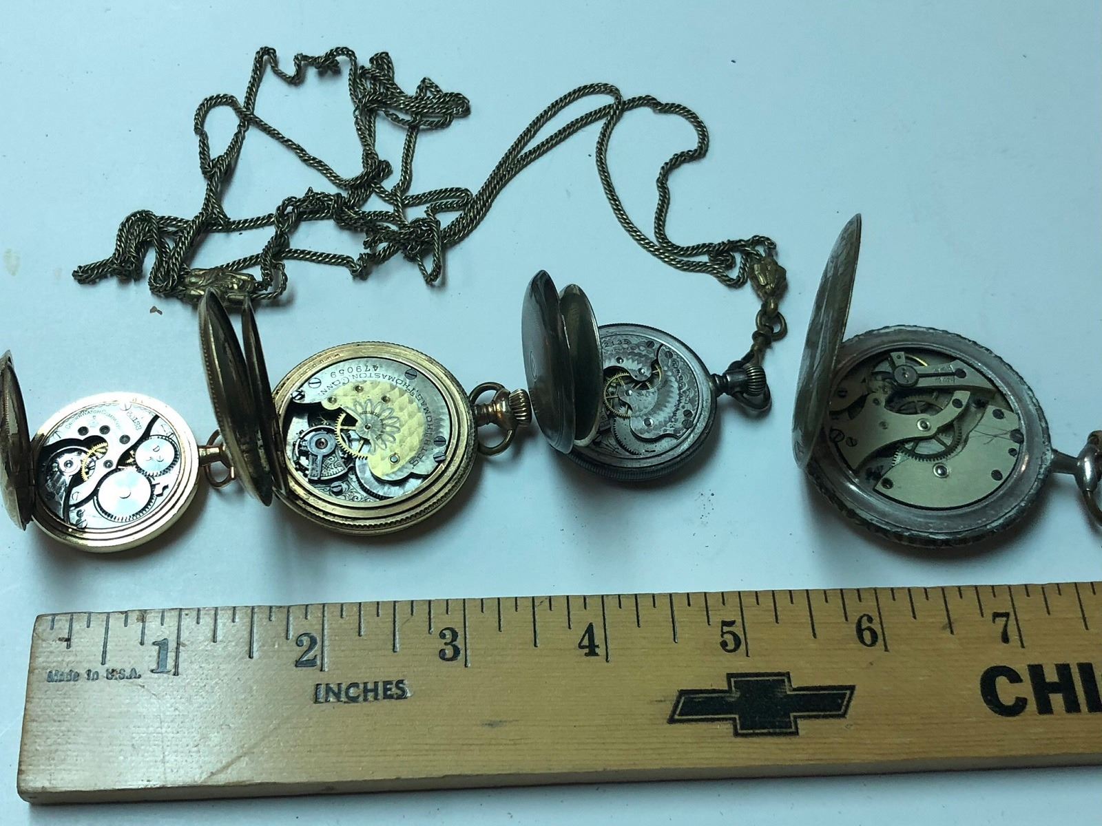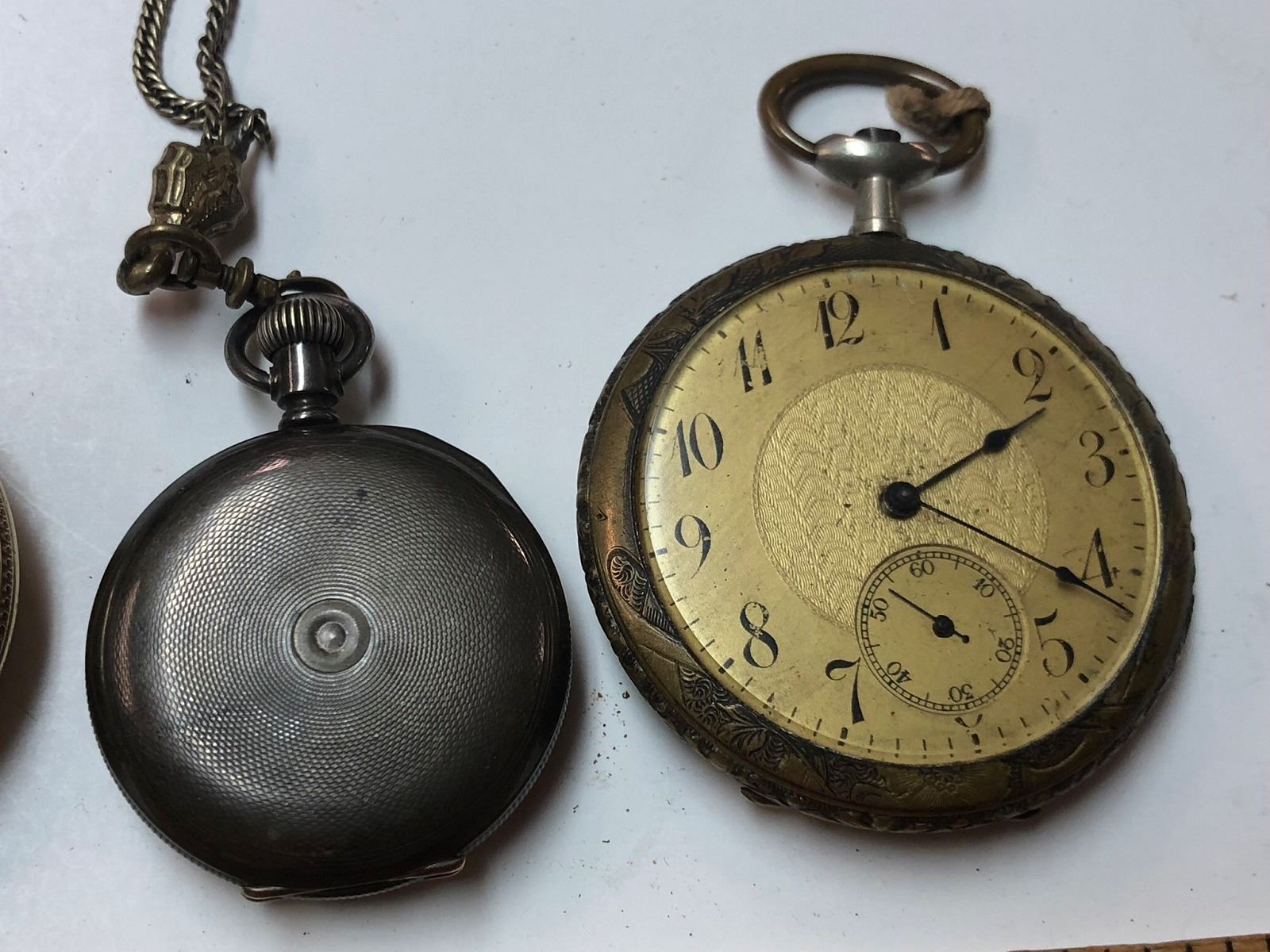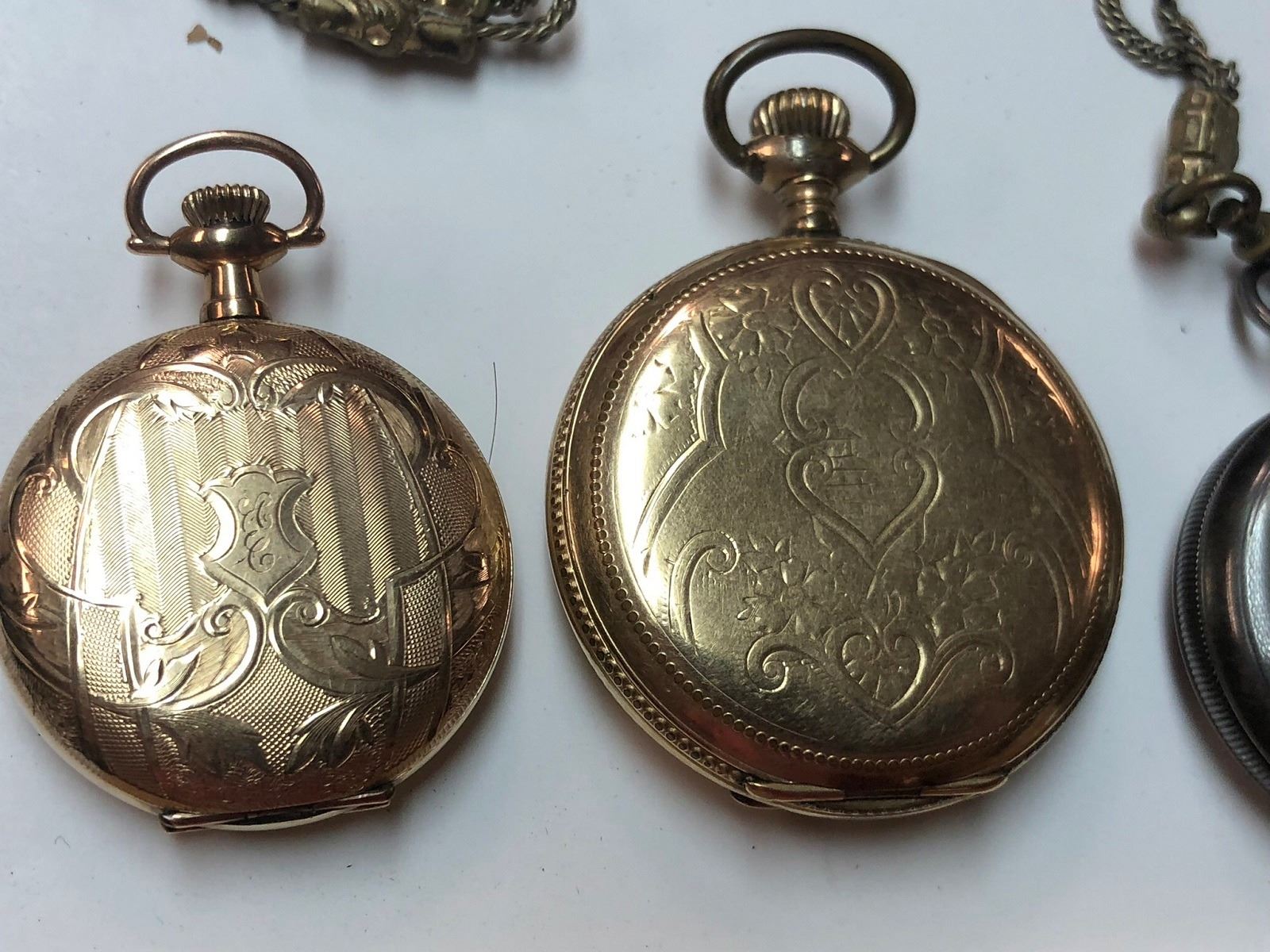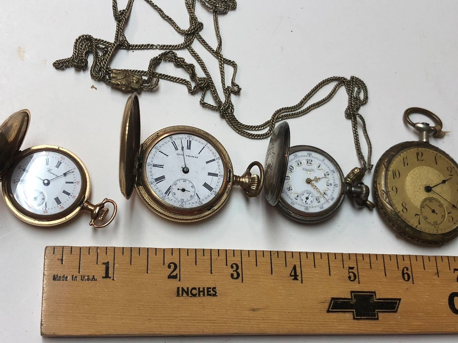 4 Pocket Watches, one is a nice art nouveau style, silver and gold filled, one with watch chain, and Seth Thomas pocket watches.